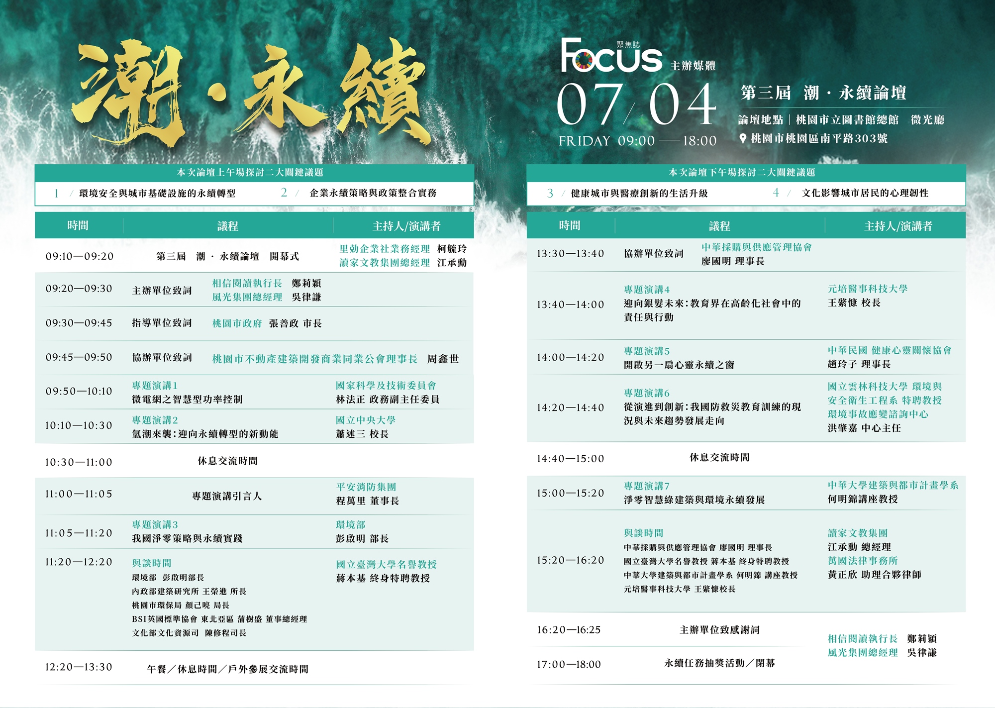 延續前兩屆的圓滿舉辦,第三屆「潮・永續論壇」將以更專注、充實且實務導向的方式呈現。不僅深化議題參與,更是一次與難得專業人士、專家學者面對面交流的絕佳契機。