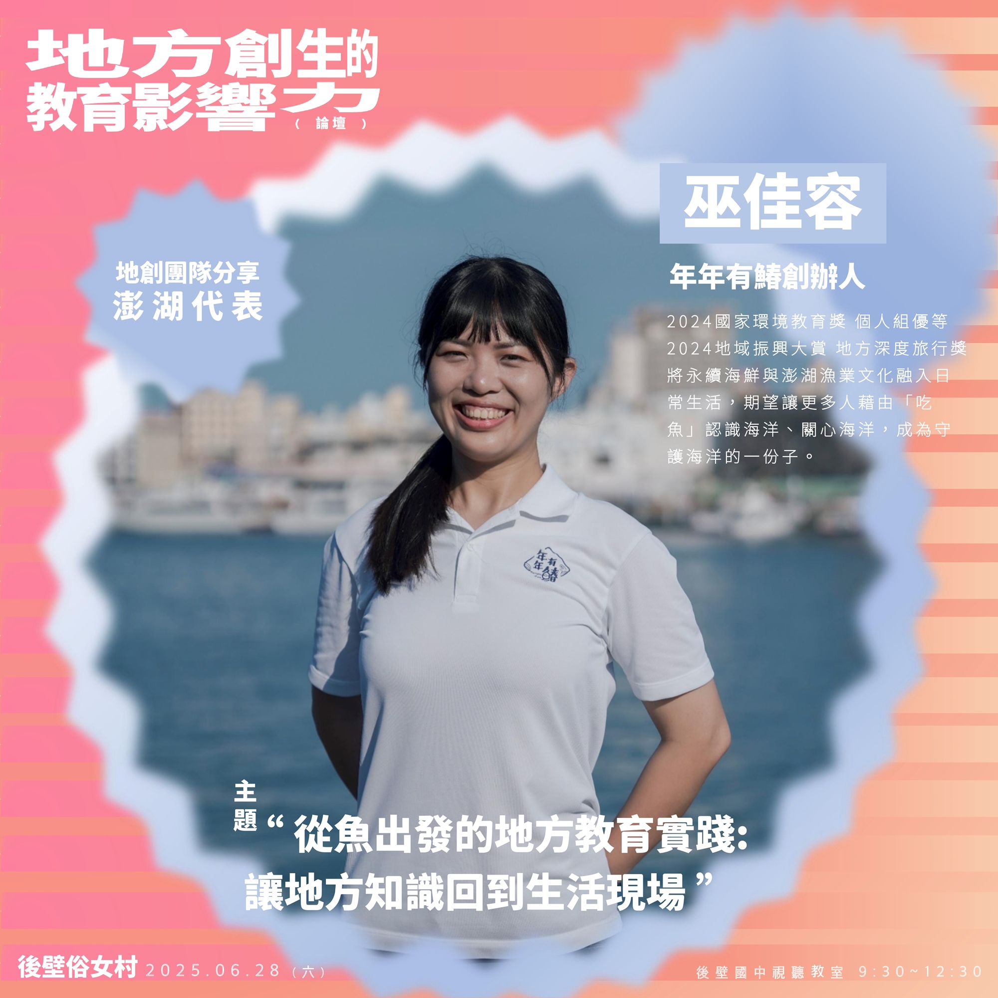 因熱愛鯨豚而移居澎湖,致力於推廣永續海洋觀念,長期關注海洋保育議題。自2017年定居澎湖後,觀察到漁業對海洋生態的衝擊,決定以食魚教育作為切入點,於2020年創立「年年有鰆」品牌。透過結合在地旅遊、用餐體驗與教具設計,將永續海鮮與澎湖漁業文化融入日常生活,期望讓更多人藉由「吃魚」認識海洋、關心海洋,成為守護海洋的一份子。