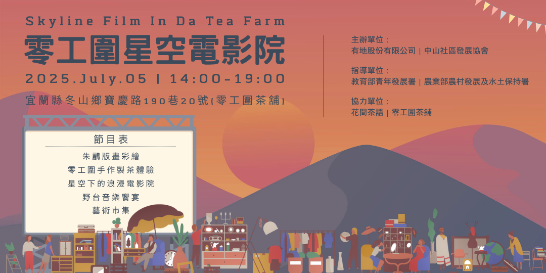 入夜後將茶園周邊路燈關閉,在寧靜山邊欣賞戶外電影,搭配內容豐富的市集,一同在茶園的傍晚,聽著蟲鳴,享受美食及電影。