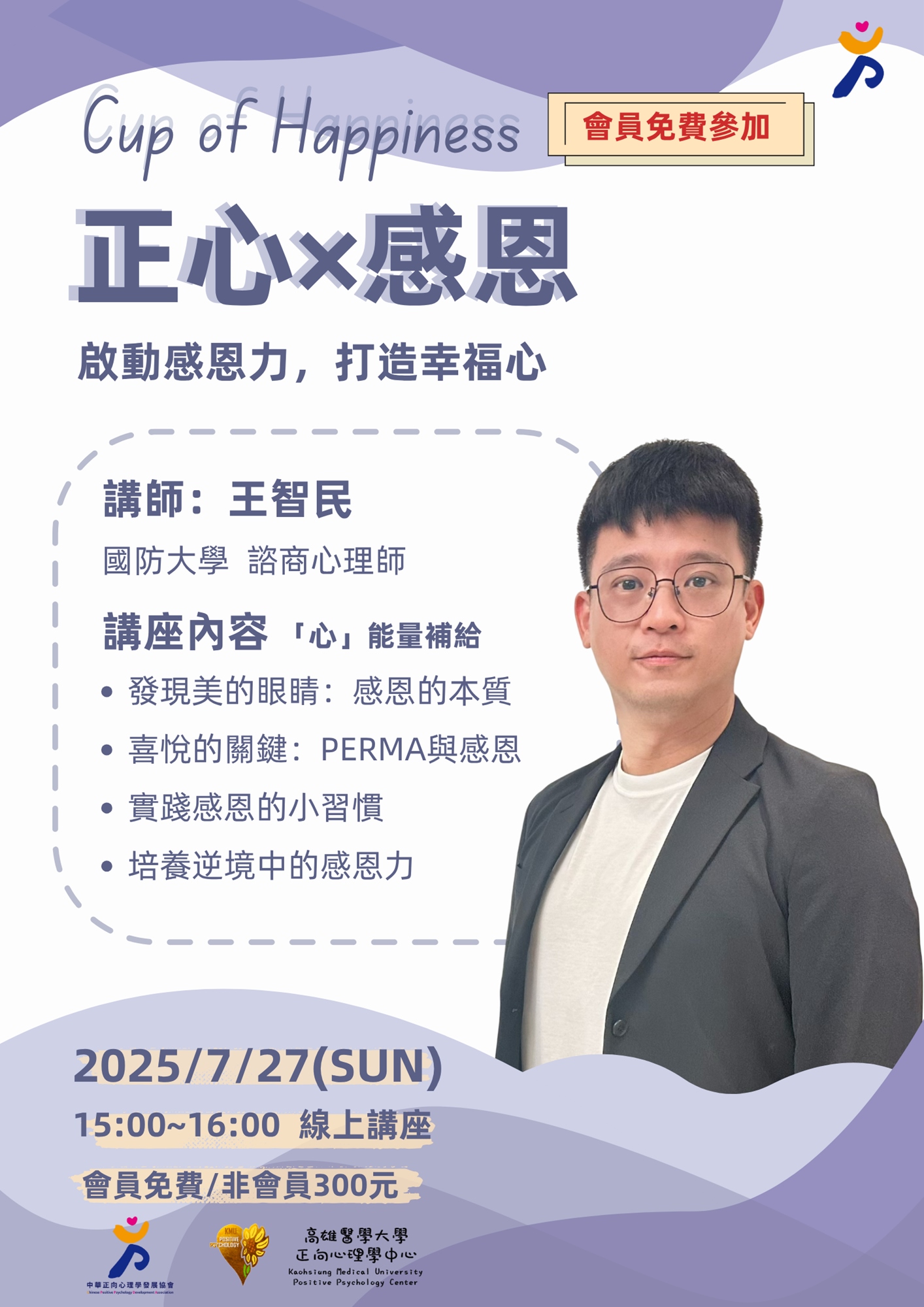 正心下午茶為中華正心協會的會員專屬福利活動~每個月固定一場,講座時長為一個小時!在2025年˙7月份,我們邀請到王智民講師,以「正心x感恩」為題,帶我們一起開啟幸福模式。🤩ˊ