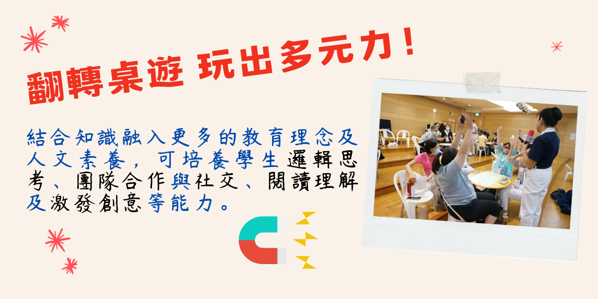 以寓樂為設計,以啟發為目標,運用創意桌遊輔助孩童學習,提升孩子的學習力、專注力、反應敏捷力、邏輯思考力以及想像力等;教師亦運用桌遊,讓課堂變得「歡笑」且「有效」!
