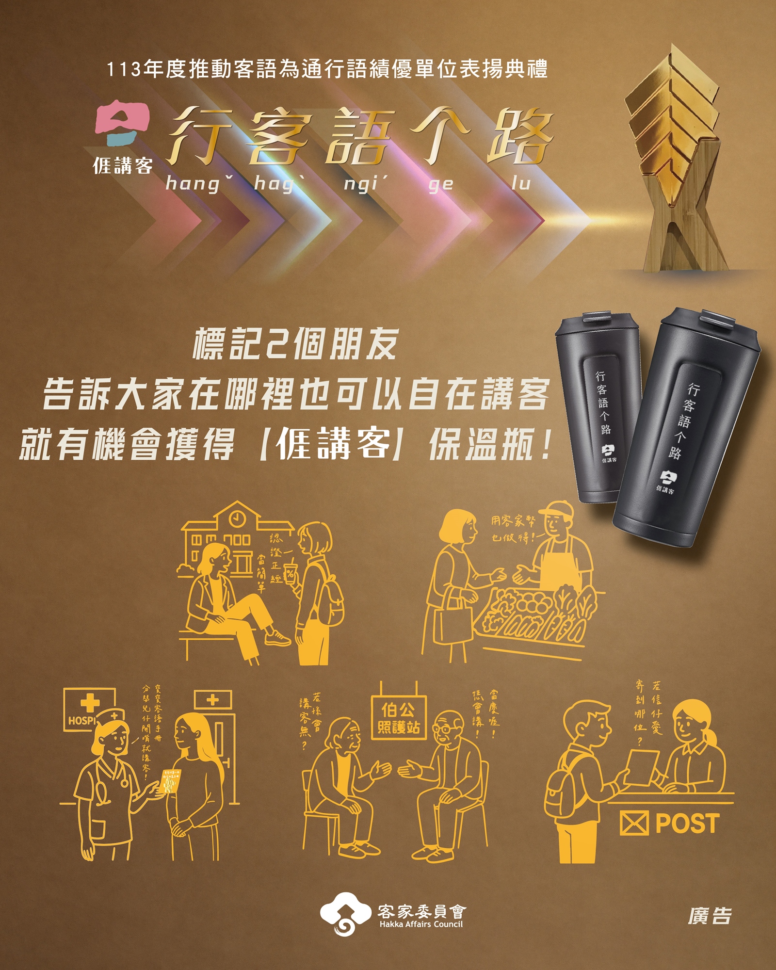 參加方法:至客家委員會FACEBOOK活動貼文下標註二位朋友並留言告訴大家在哪裡也可以自在講客。