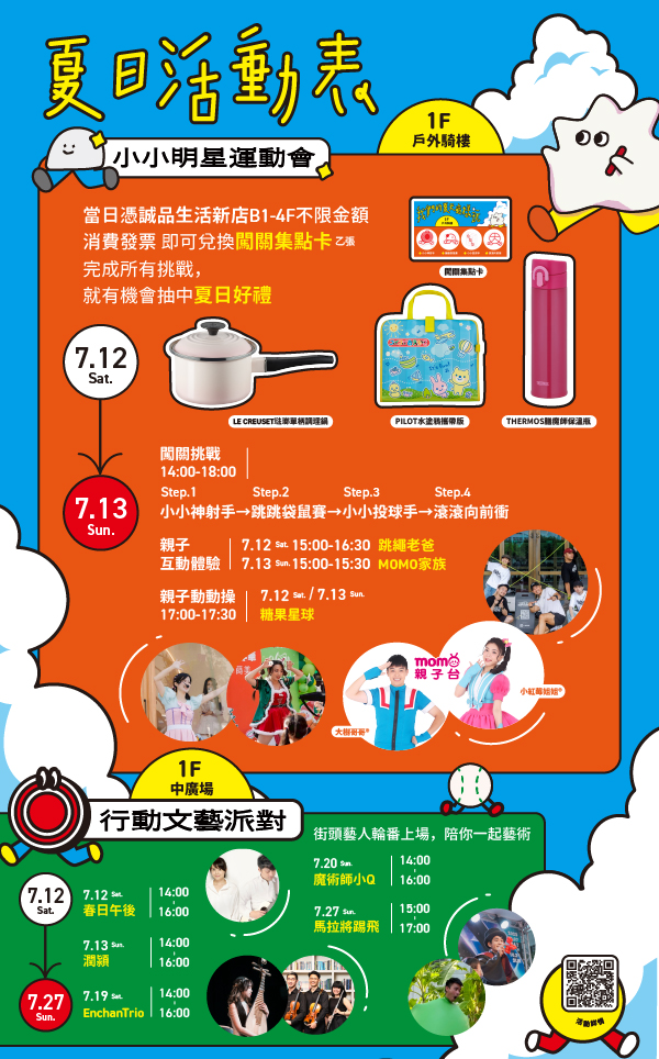 | 7.12 Sat. | 15:00-16:30|跳繩老爸 ⚠️跳繩老爸親子跳繩活動,需自備跳繩,現場恕不提供⚠️ | 17:00-17:30|糖果星球姊姊 |