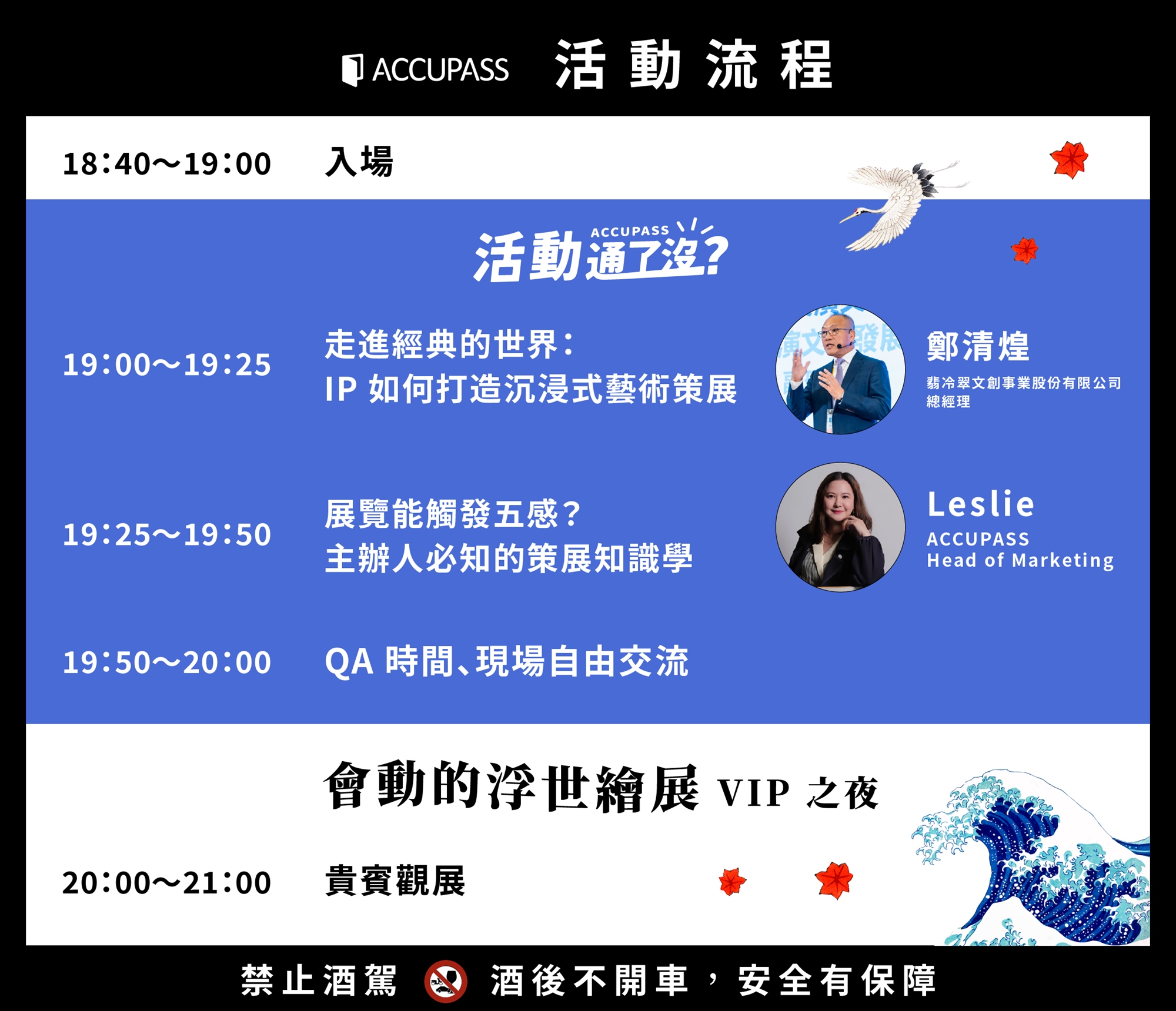 ✨這不只是「看畫」,而是一場用五感體驗的藝術旅程。本場 ACCUPASS 貴賓之夜,讓我們一同親臨現場,透過專屬語音導覽,穿越時空走進浮世繪的世界,見證日本美學的永恆魅力!