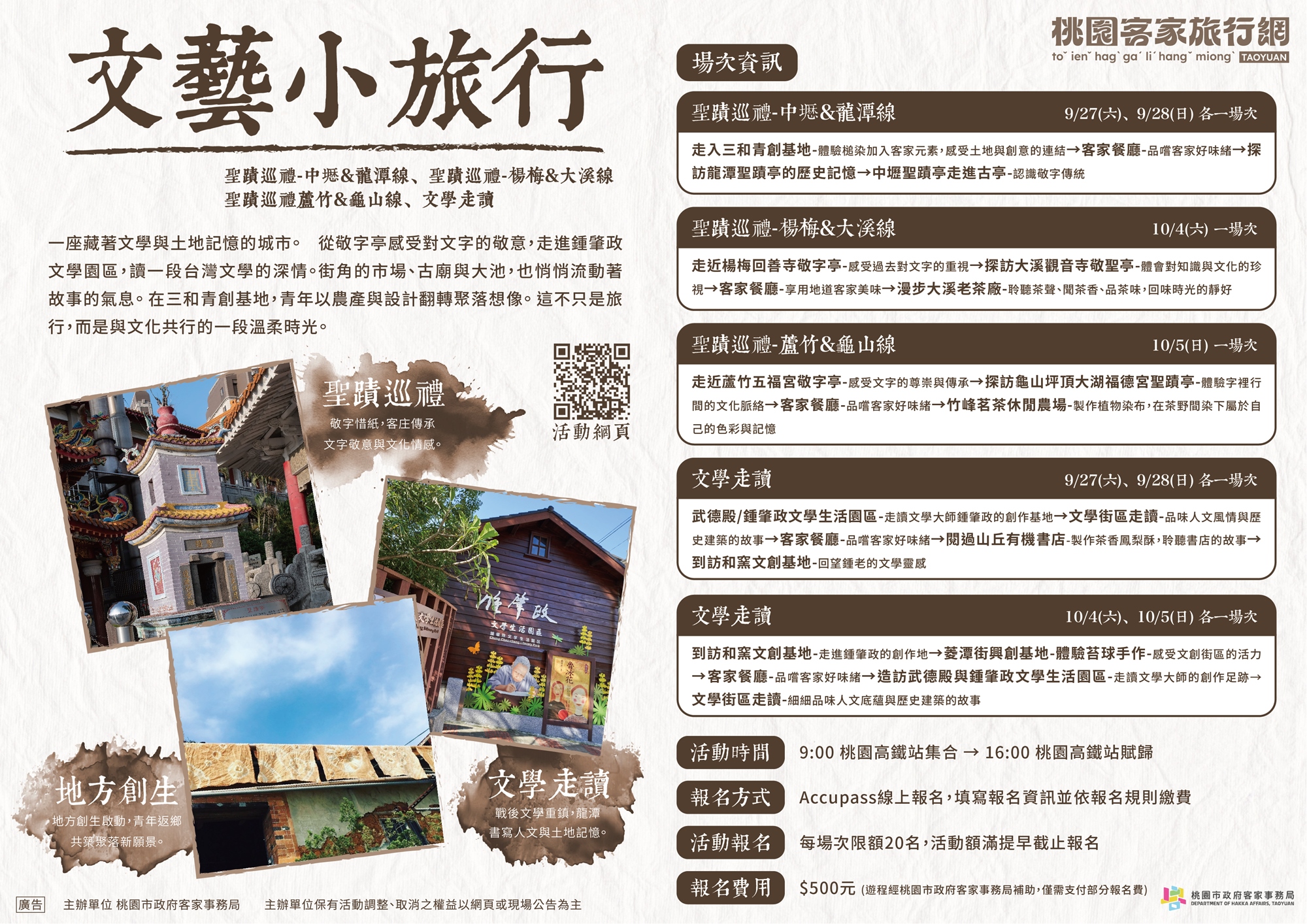 - 報名費用:$500元 (經桃園市政府客家事務局補助,僅需支付部份報名費)