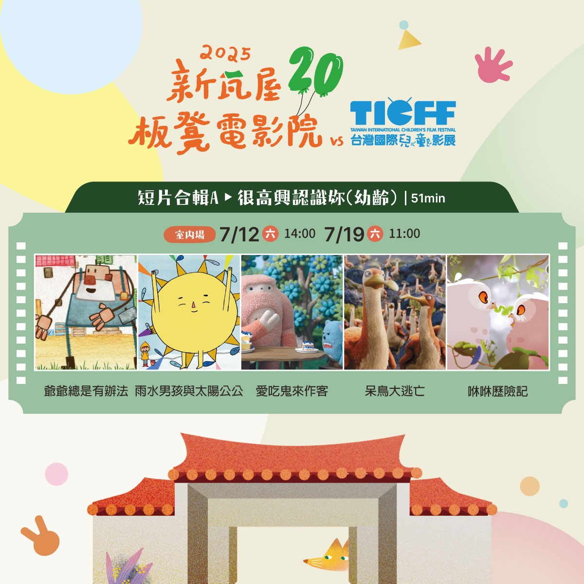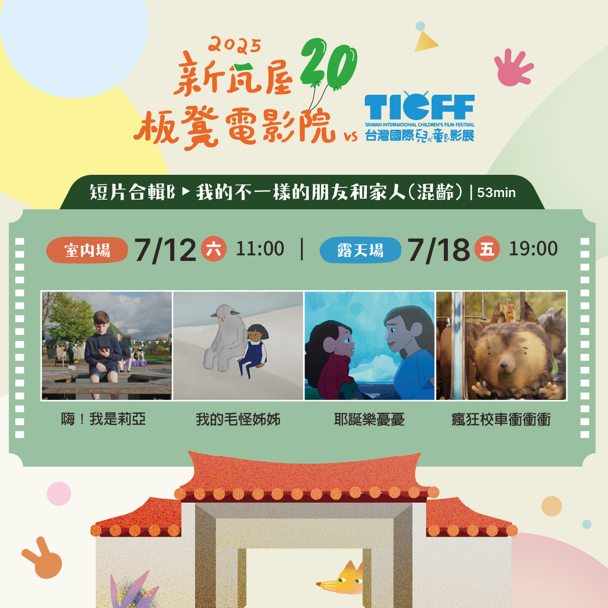 首先在7/12及7/19兩個週六,將於新瓦屋集會堂室內帶來多部短片合集,部分場次將配合映後座談及體驗活動,精彩可期!