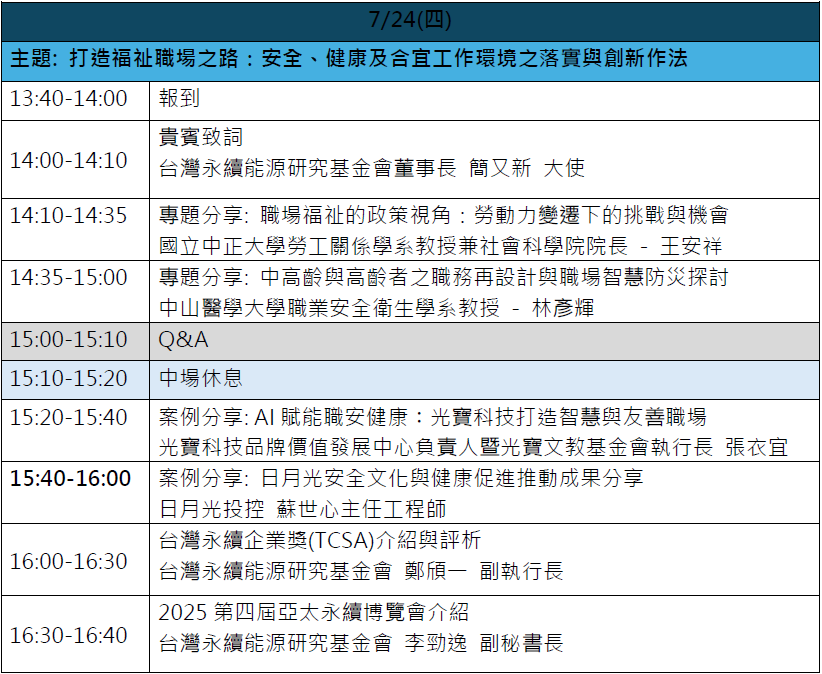此外,現場也將邀請2024年台灣企業永續獎「職場福祉領袖獎」獲獎企業代表光寶科技品牌價值發展中心負責人暨光寶文教基金會張衣宜執行長,以及日月光投控蘇世心主任工程師分享實際案例與推動成果,提供業界寶貴的參考與借鏡。同時,TAISE鄭頎一副執行長也將說明台灣職安領袖獎的推動理念與參與方式,鼓勵企業共同投入,打造更具韌性與幸福感的工作環境。