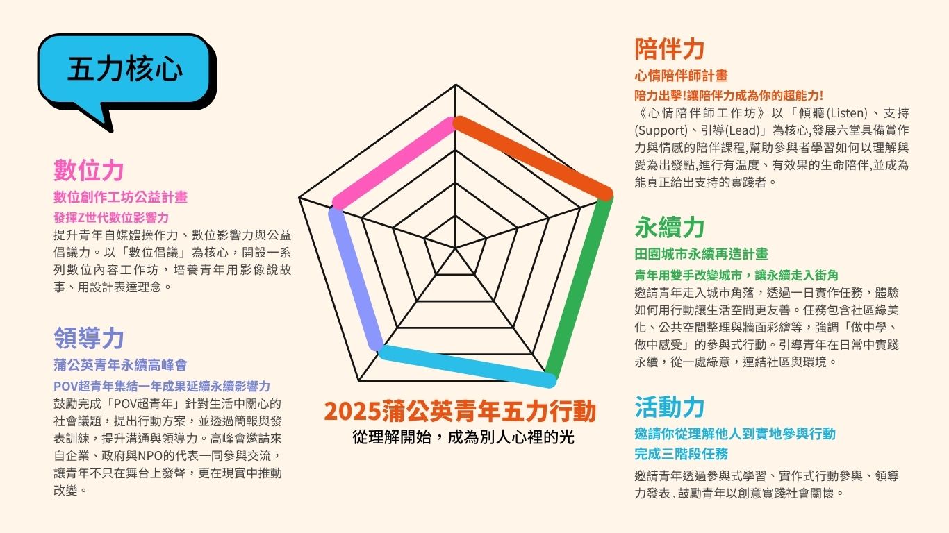 提升青年自媒體操作力、數位影響力與公益倡議力。以「數位倡議」為核心,開設一系列數位內容工作坊,培養青年用影像說故事、用設計表達理念。