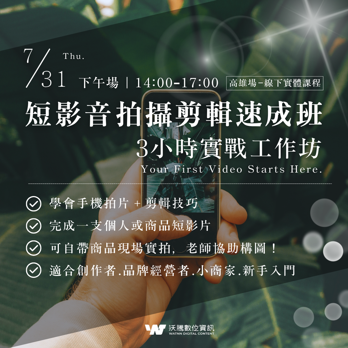 一堂適合 想打造個人品牌、行銷產品、提升自媒體表現力 的入門實作課。學員將在 3 小時內學會基礎拍攝+剪輯技巧,並實作完成一支個人或產品的短影片!