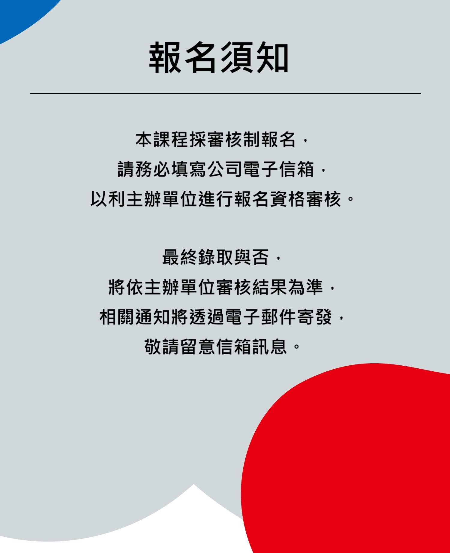 3. 本課程採審核制報名,請確實填寫公司名稱及公司電子信箱,以利主辦單位進行審核。最終是否錄取,將依審核結果為準,敬請留意相關通知。