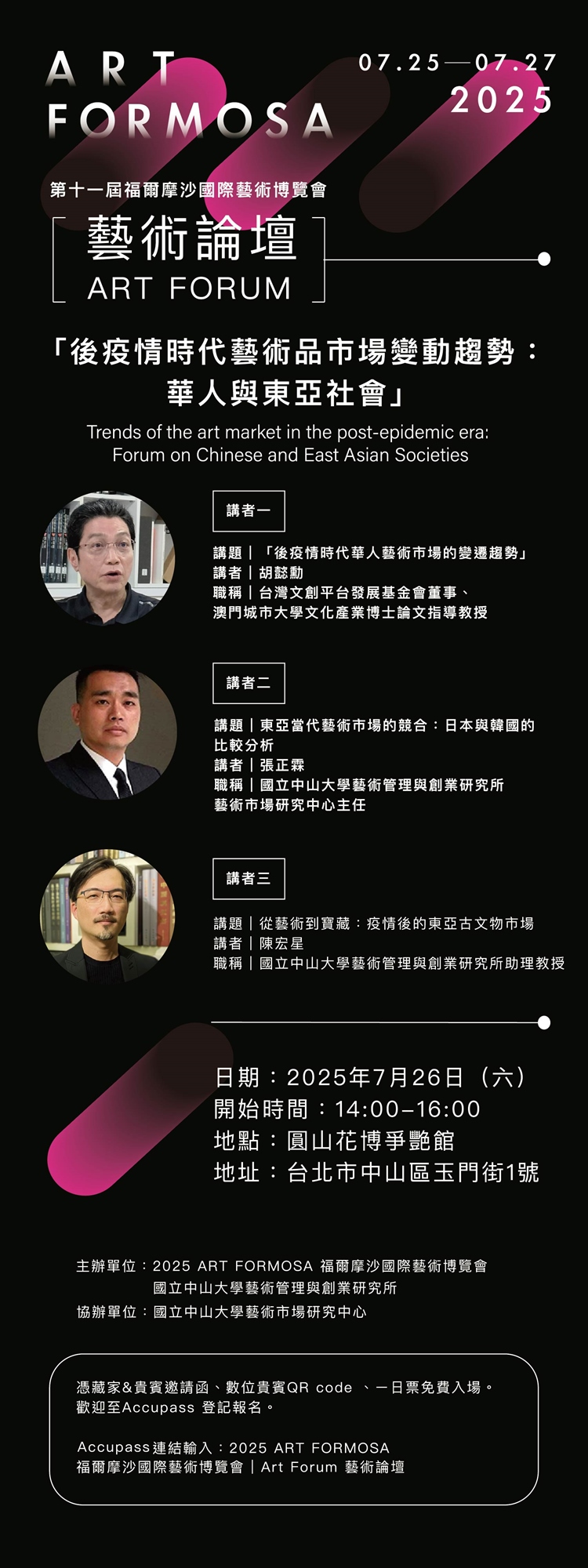 本論壇由中山大學國立中山大學藝術管理與創業研究所主辦,國立中山大學藝術市場研究中心協辦,旨在探討後疫情時代華人藝術市場的變化及其對收藏取向的影響,通過邀請三位專家學者進行深入剖析,為相關收藏及藝術品商業實踐提供啟發與參考。