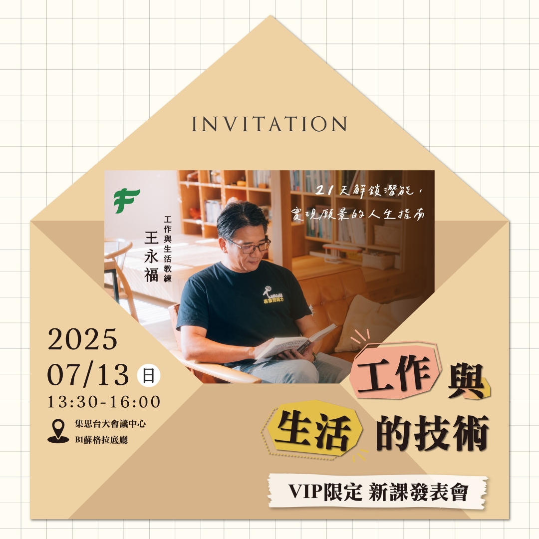 你曾經參與《簡報的技術》、《教學的技術》,也持續關注福哥在工作與生活間的實踐分享。這一次,福哥用 21 天打造的線上課程《工作與生活的技術》,將首次對外亮相,我們誠摯邀請您——參與這場VIP限定的課程發表會!