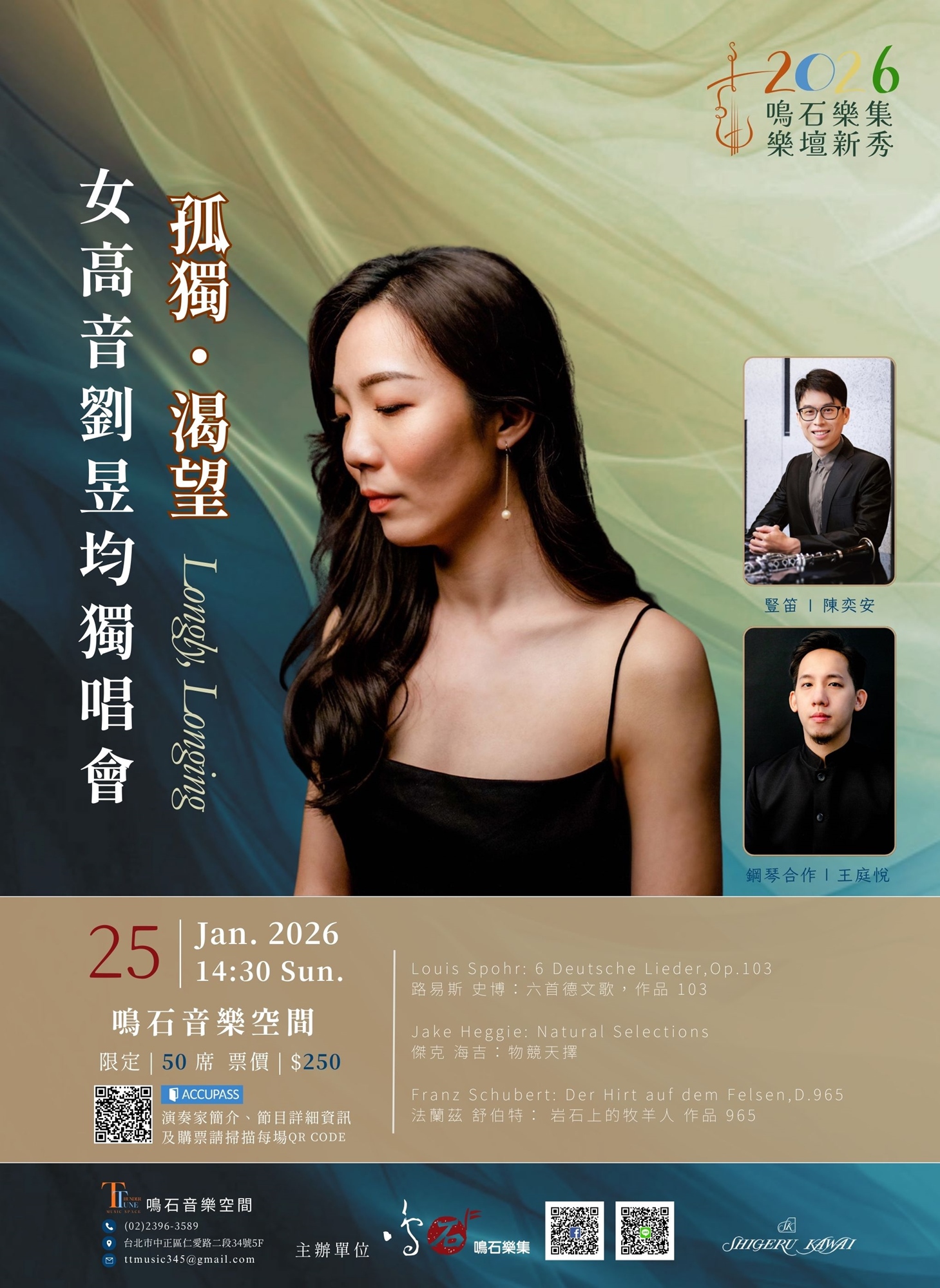 曲目包涵路易斯 史博(Louis Spohr) 的《六首德文歌》(Sechs Deutsche Lieder)、傑克 海吉(Jake Heggie) 的《物競天擇》(Natural Selection) 及法蘭茲 舒伯特 (Franz Schubert) 的《岩石上的牧羊人》(Der Hirt auf dem Felsen) 以「孤獨」為軸心,探索對情感依戀、生存力量以及自由追尋的深切「渴望」。