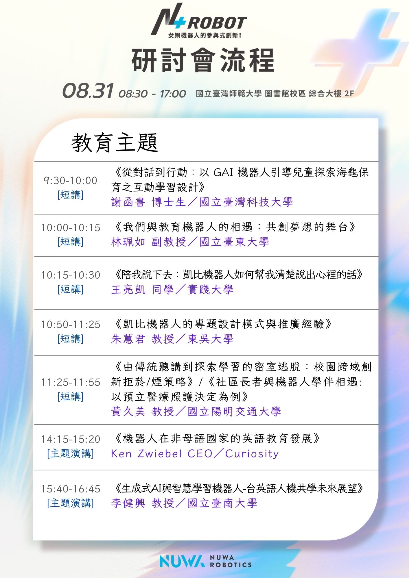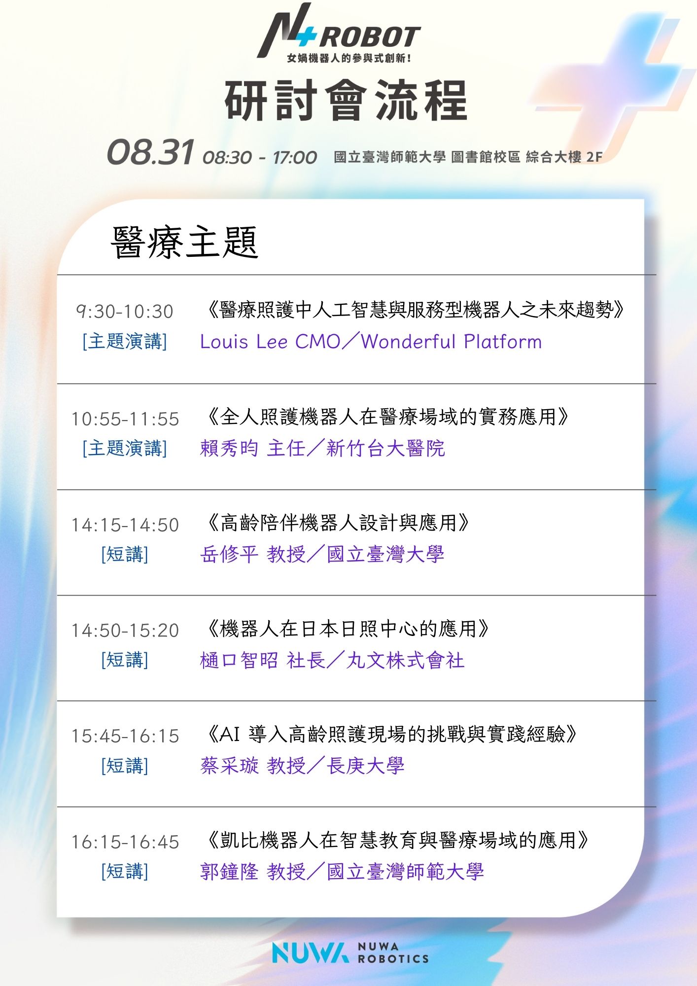 本活動由 NUWA 女媧創造 與 國立臺灣師範大學 聯合主辦,聚焦於服務型機器人在教育、健康、醫療三大場域中的實際應用與落地挑戰,打造一場跨域整合、知識交流與現場展示並重的專業研討會。