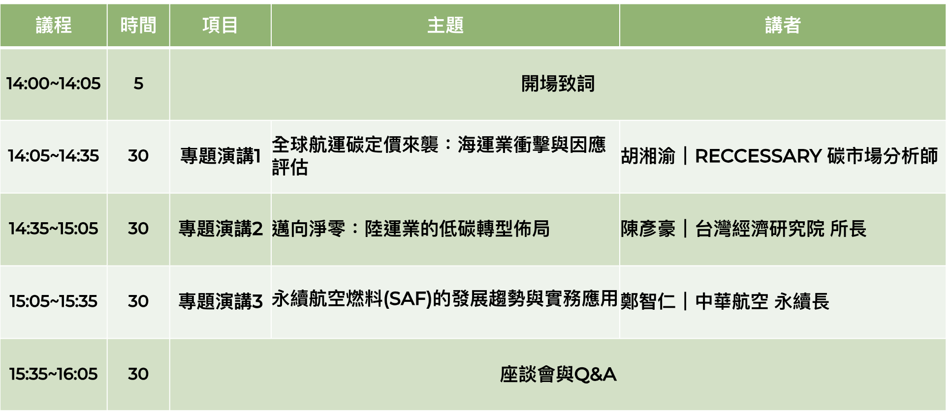 為回應全球運輸部門邁向淨零排放的趨勢,本次「運輸業淨零行動研討會」將聚焦陸、海、空三大運輸領域的減碳挑戰與實踐策略。研討會將邀集產官學界專家,針對陸運業低碳轉型、IMO全球海運碳費與永續航空燃料(SAF)等關鍵議題進行分享,期望促進跨領域對話,共同探討運輸業長期的減碳路徑與可行解方。