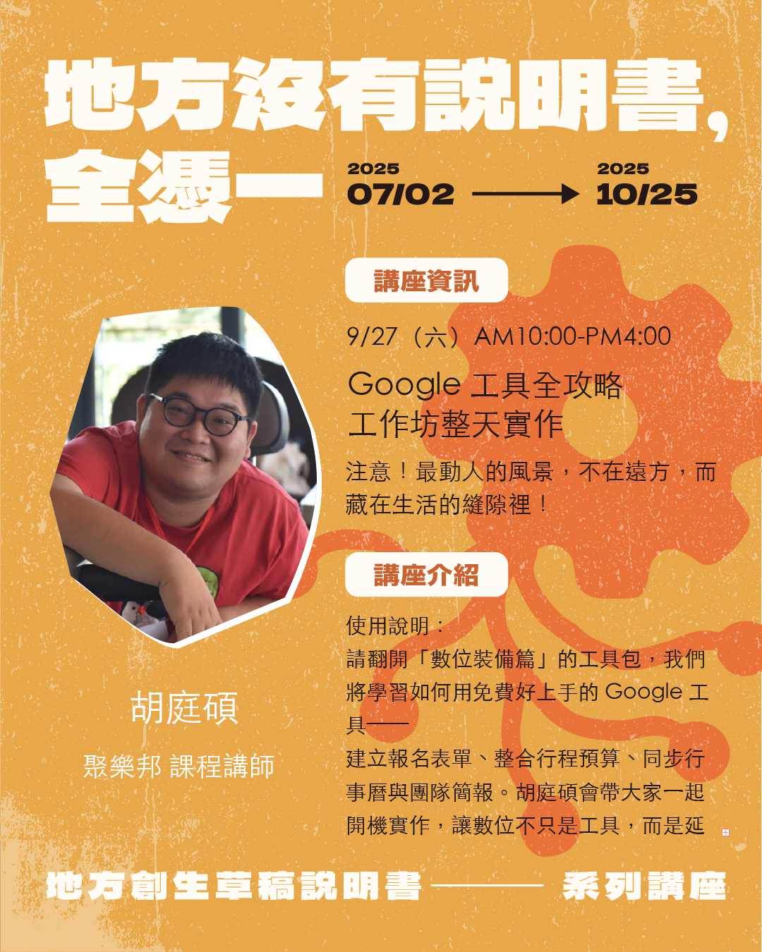他會帶大家一起開機實作,用免費、好用的 Google 工具,打造屬於你自己的地方行動支援站。