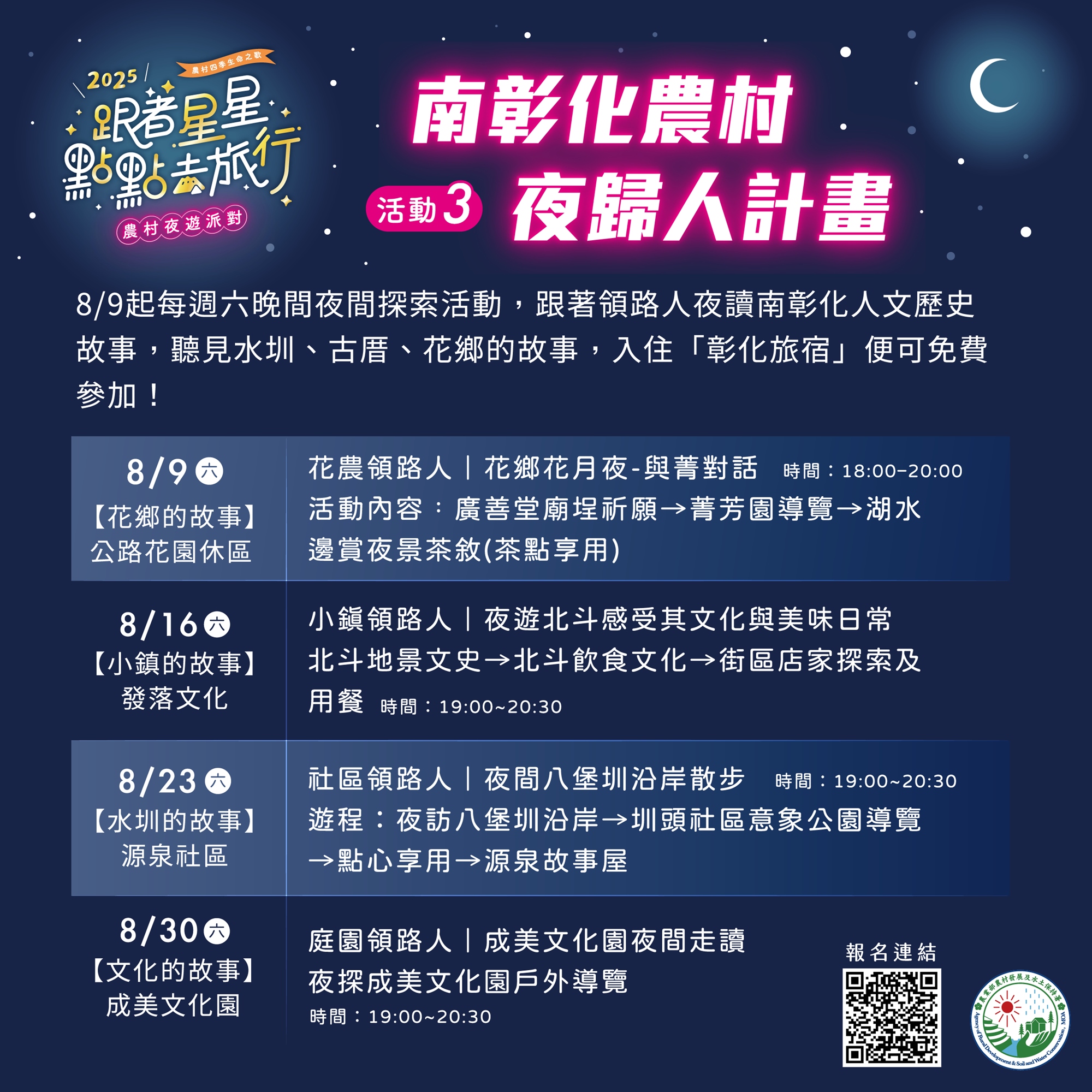 其中系列活動二「南彰化農村夜歸人計畫」,由在地領路人帶旅客夜讀南彰化人文歷史故事,探索八堡圳、成美文化園、北斗小鎮與田尾夜間風光,入住彰化旅宿即可免費參加,邀請民眾避開酷暑白日,入住彰化一晚,一起在星光下展開農村慢旅行!