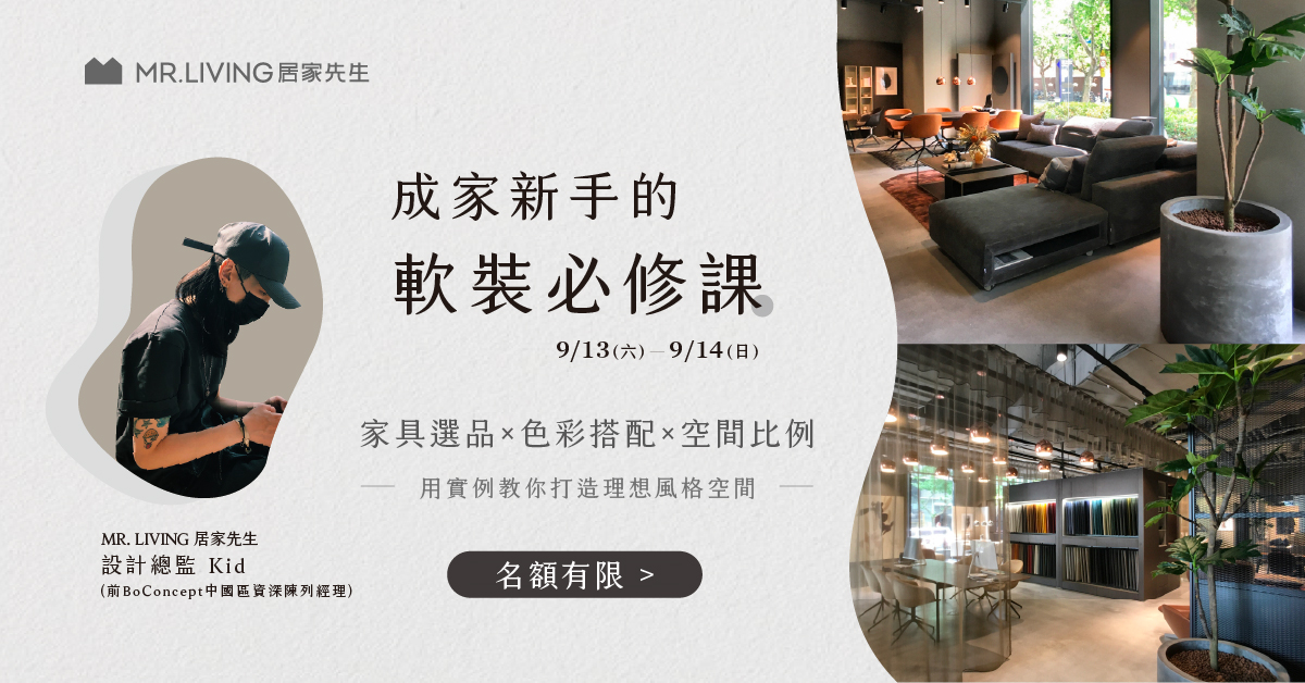 邀請MR. LIVING 居家先生設計總監(前 BoConcept 中國區資深陳列經理)Kid 親授空間搭配思維,從品牌經驗與實務案例出發,拆解成家新手最常見的佈置困擾,帶你掌握家具選品邏輯、空間比例配置、色彩搭配技巧與材質運用心法。透過軟裝,打造更有層次與溫度的生活空間。