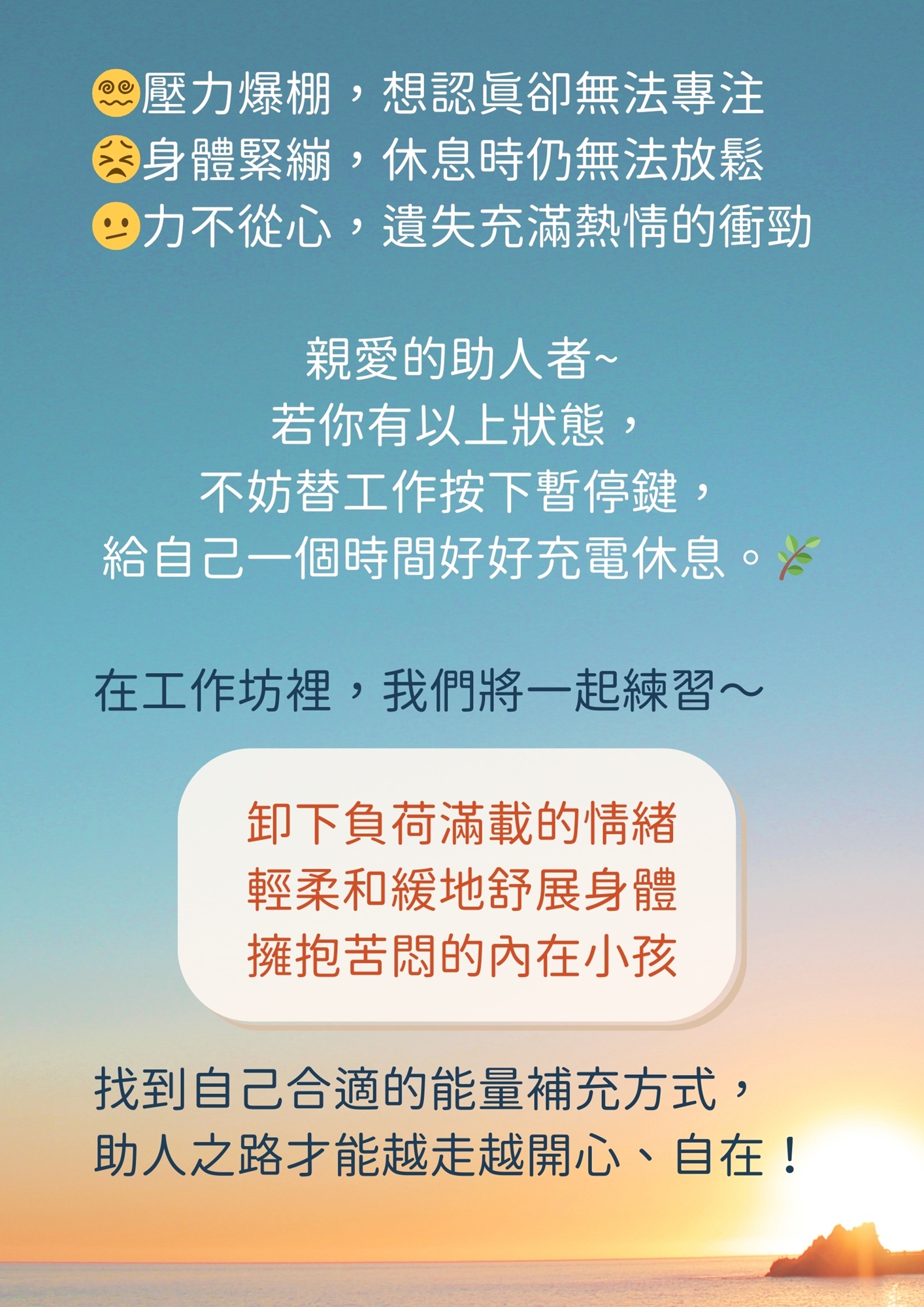 💧深化自我照顧概念:有效擴充助人者自我照顧的方法與視野,實踐身心自在力在工作生活中。