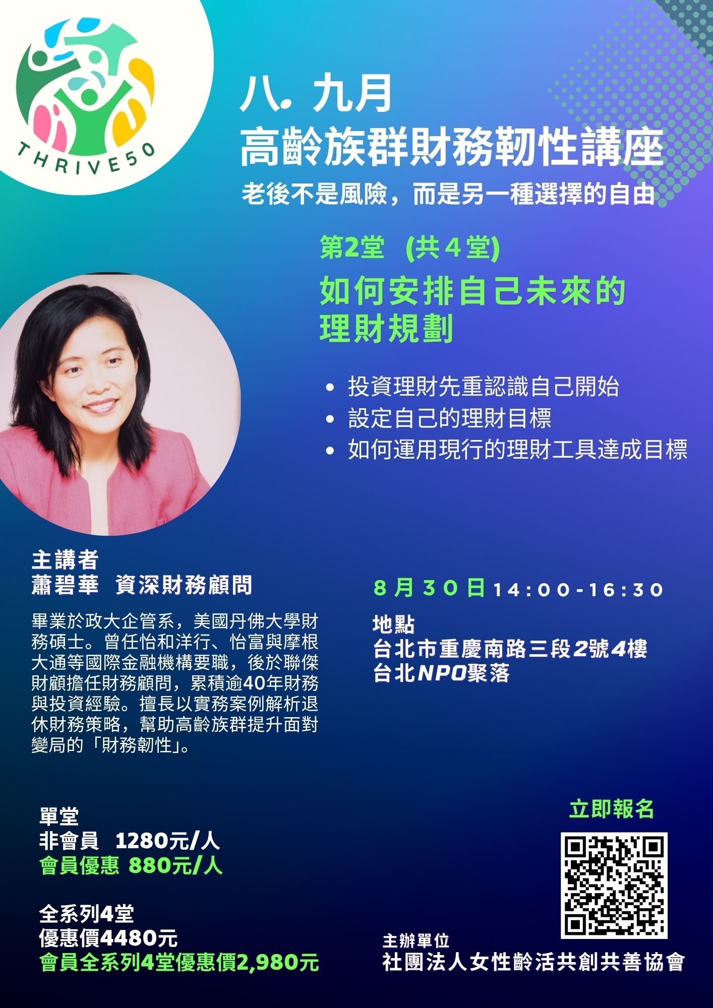 第1堂 8/16(六)高齡財務規劃的重要因素 林祐蘭/ 報名頁連結