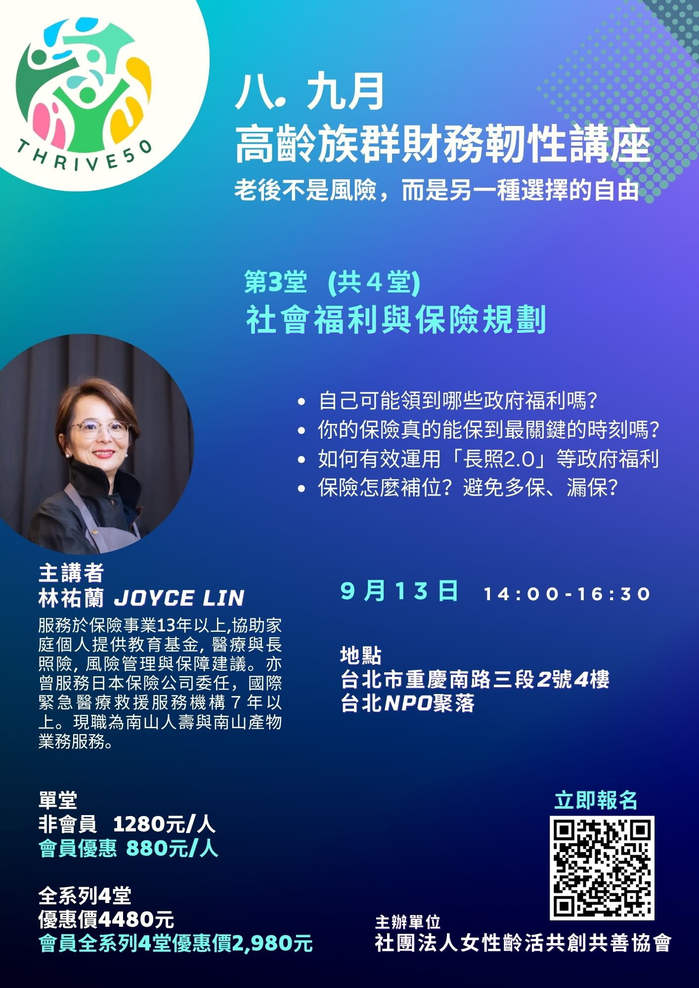 第1堂 8/16(六)高齡財務規劃的重要因素 林祐蘭/ 報名頁連結