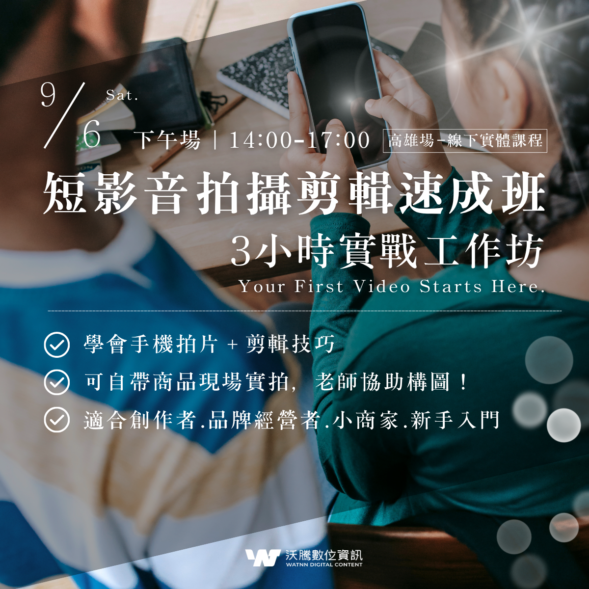 一堂適合 想打造個人品牌、行銷產品、提升自媒體表現力 的入門實作課。學員將在 3 小時內學會基礎拍攝+剪輯技巧!