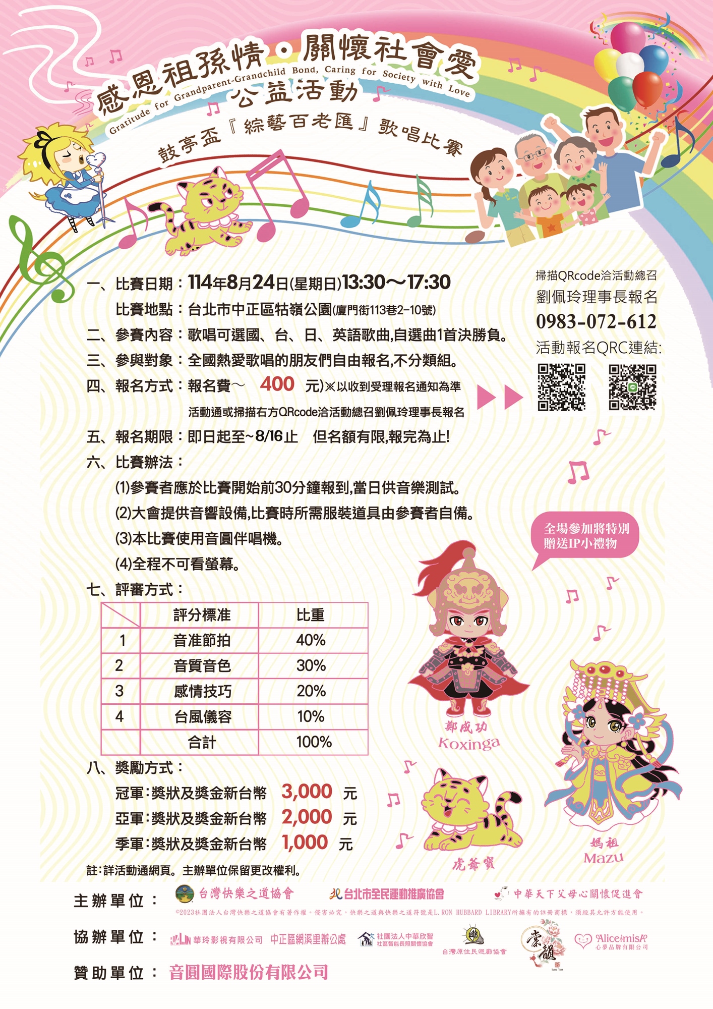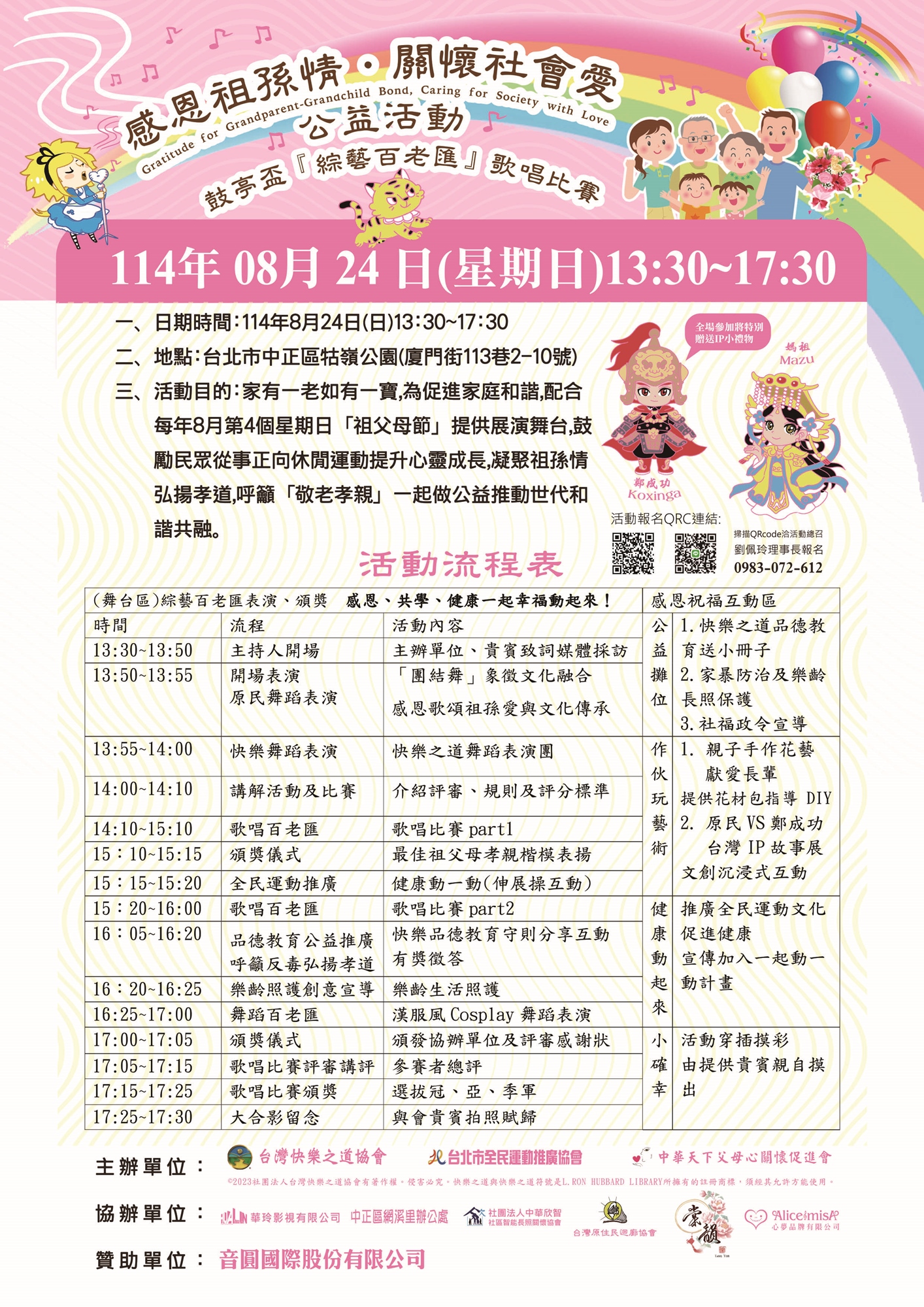 推廣正向休閒運動與公益精神,歌唱帶來歡樂乃民眾最佳休閒,鼓勵大眾以歌會友,勇於追夢表現自我,在別有意義之祖父母節邀親子三代同堂並同樂看表演甚至參與歌唱比賽飆唱,透過歌唱舒緩心理壓力提升心靈成長,與長者互動達到弘揚孝道並呼籲「文教、反毒、運動」之宣導目的,結合原民文化教育及IP故事力ESG for Culture倡議,營造世代共融友善多元族群社會以促使社會充滿愛與和諧氛圍,分享愛與喜樂一起做公益,唱出健康、老幼共融。