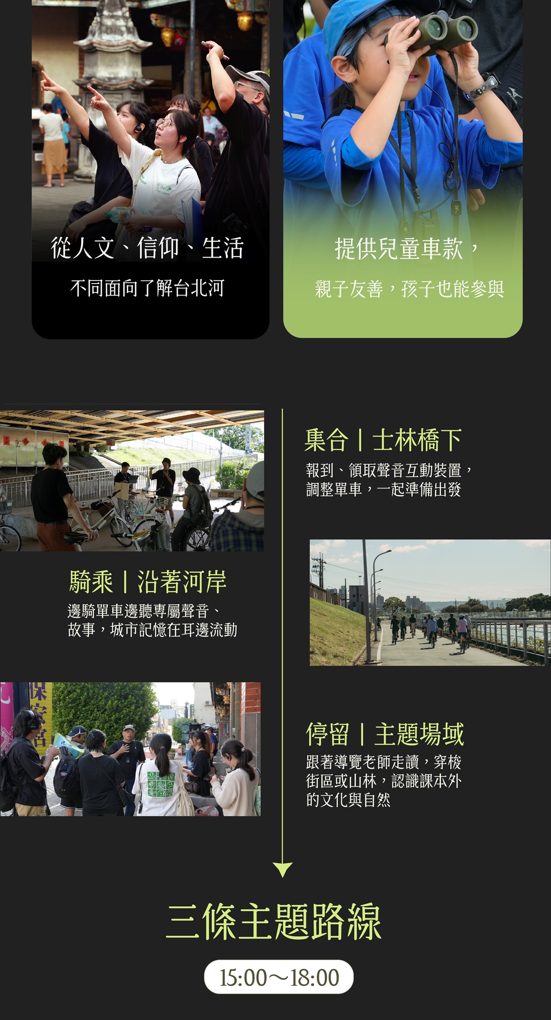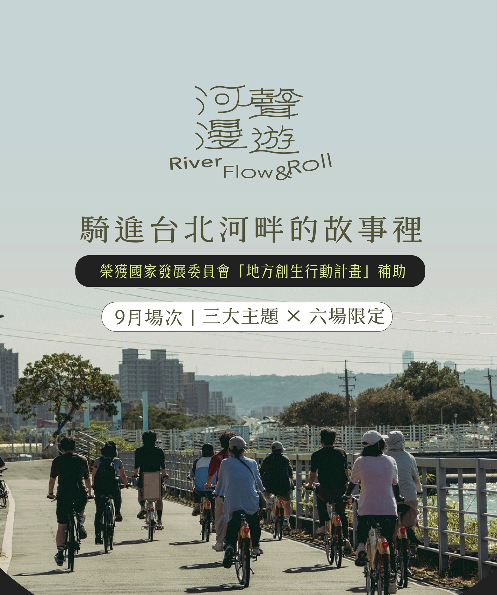 《河聲漫遊》是一場騎自行車結合聲音藝術、與場域走讀的體驗,參與者將透過互動聲音裝置與在地走讀,深入感受台北河岸的歷史紋理與文化溫度。