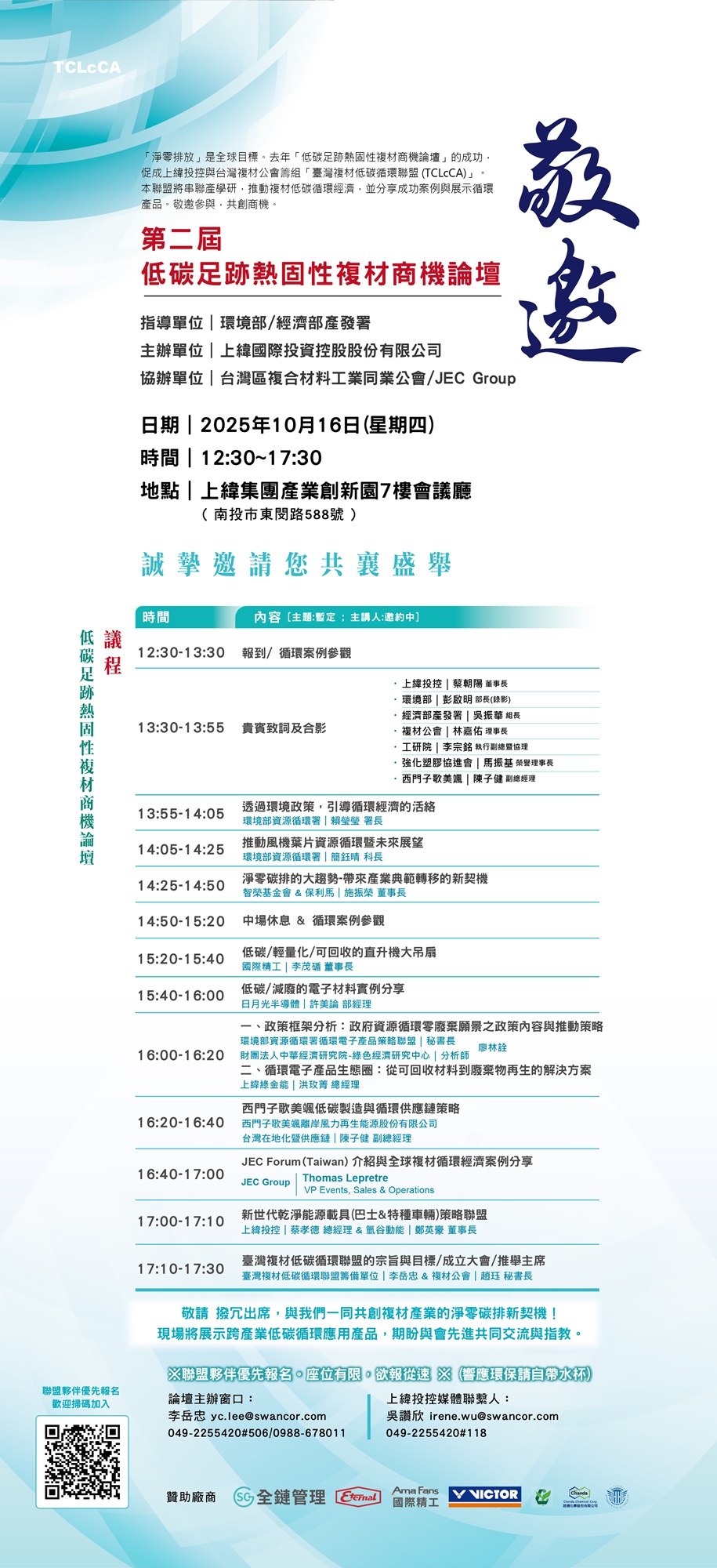 敬請您撥冗出席,將使活動倍增榮彩與圓滿,與我們攜手共襄盛舉,一同開創淨零碳排時代下,循環經濟產業的無限新契機!