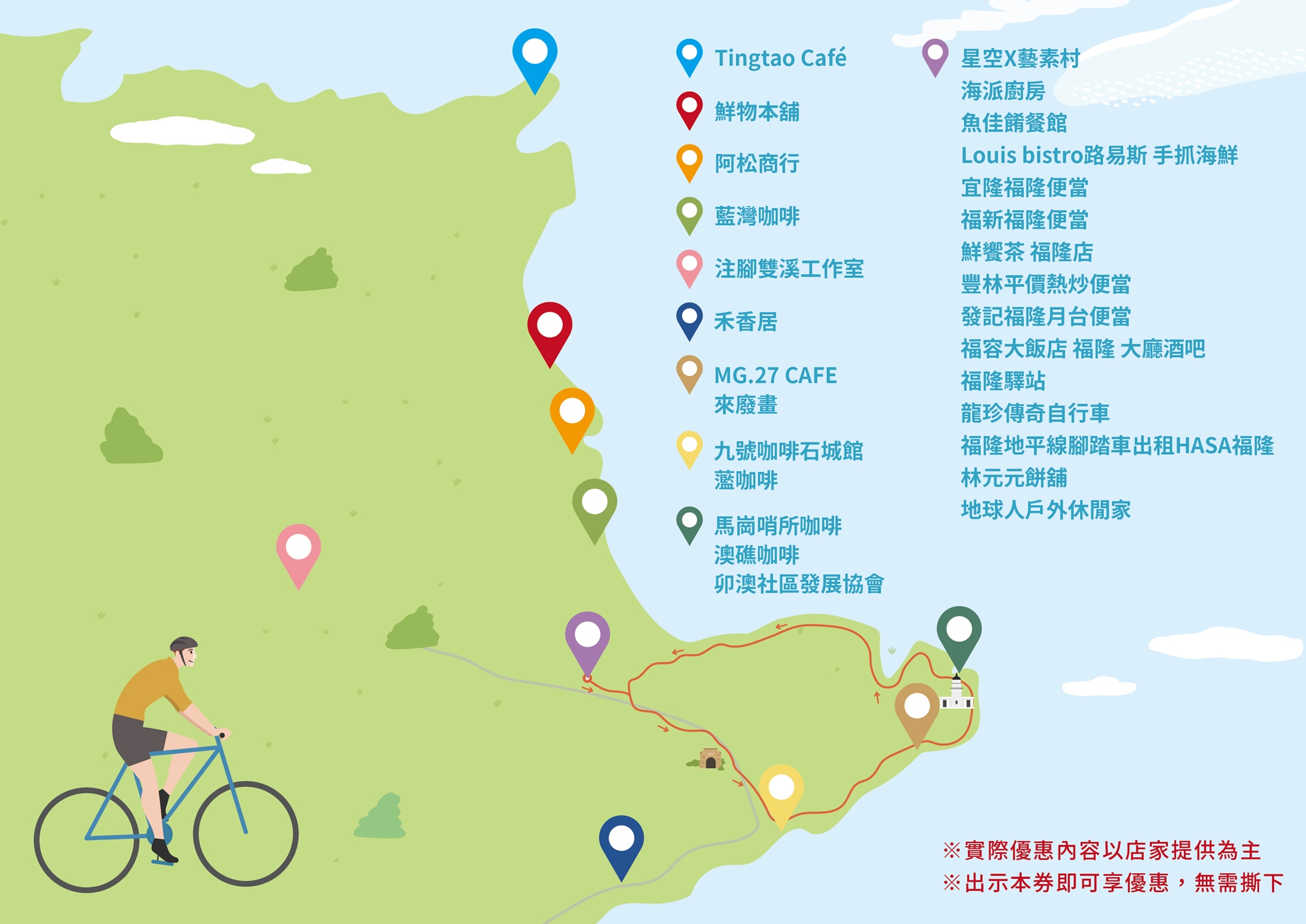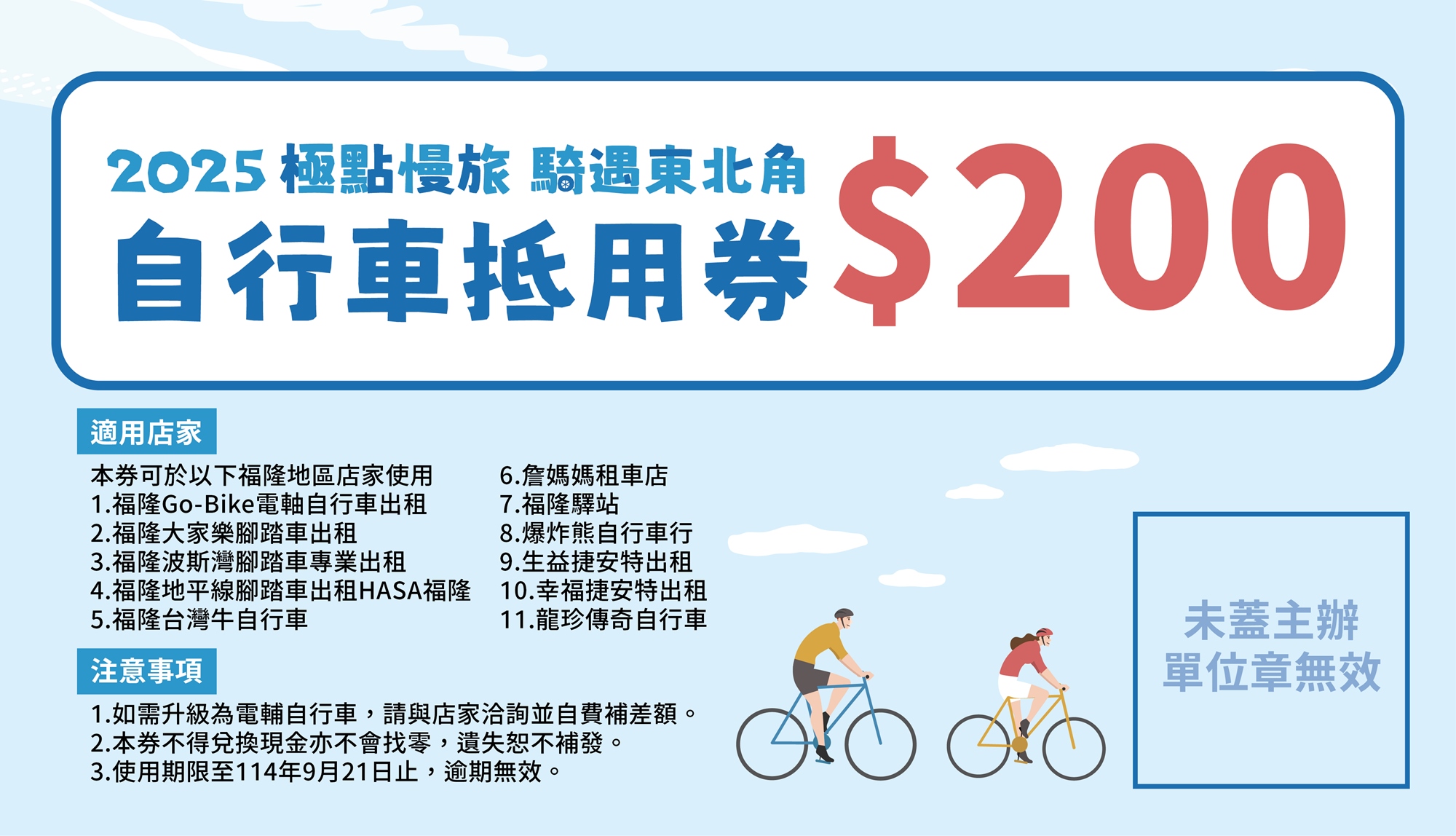 ■租車券適用店家:福隆Go-Bike 電輔自行車出租、福隆大家樂腳踏車出租福隆波斯灣腳踏車專業出租、福隆地平線腳踏車出租 HASA福隆、福隆台灣牛自行、詹媽媽租車店、福隆驛站、爆炸熊自行車行、生益捷安特出租、幸福捷安特出租、龍珍傳奇自行車