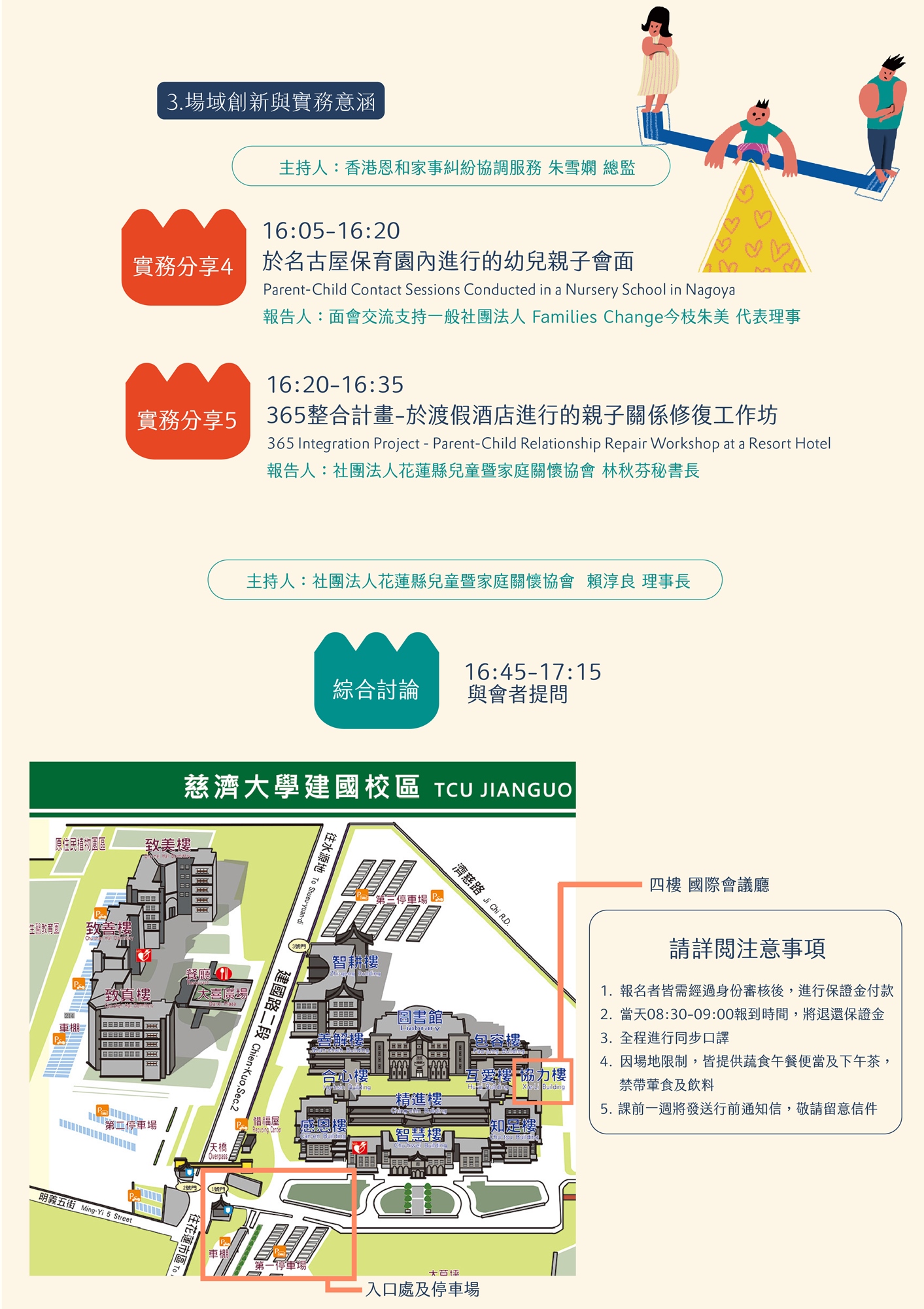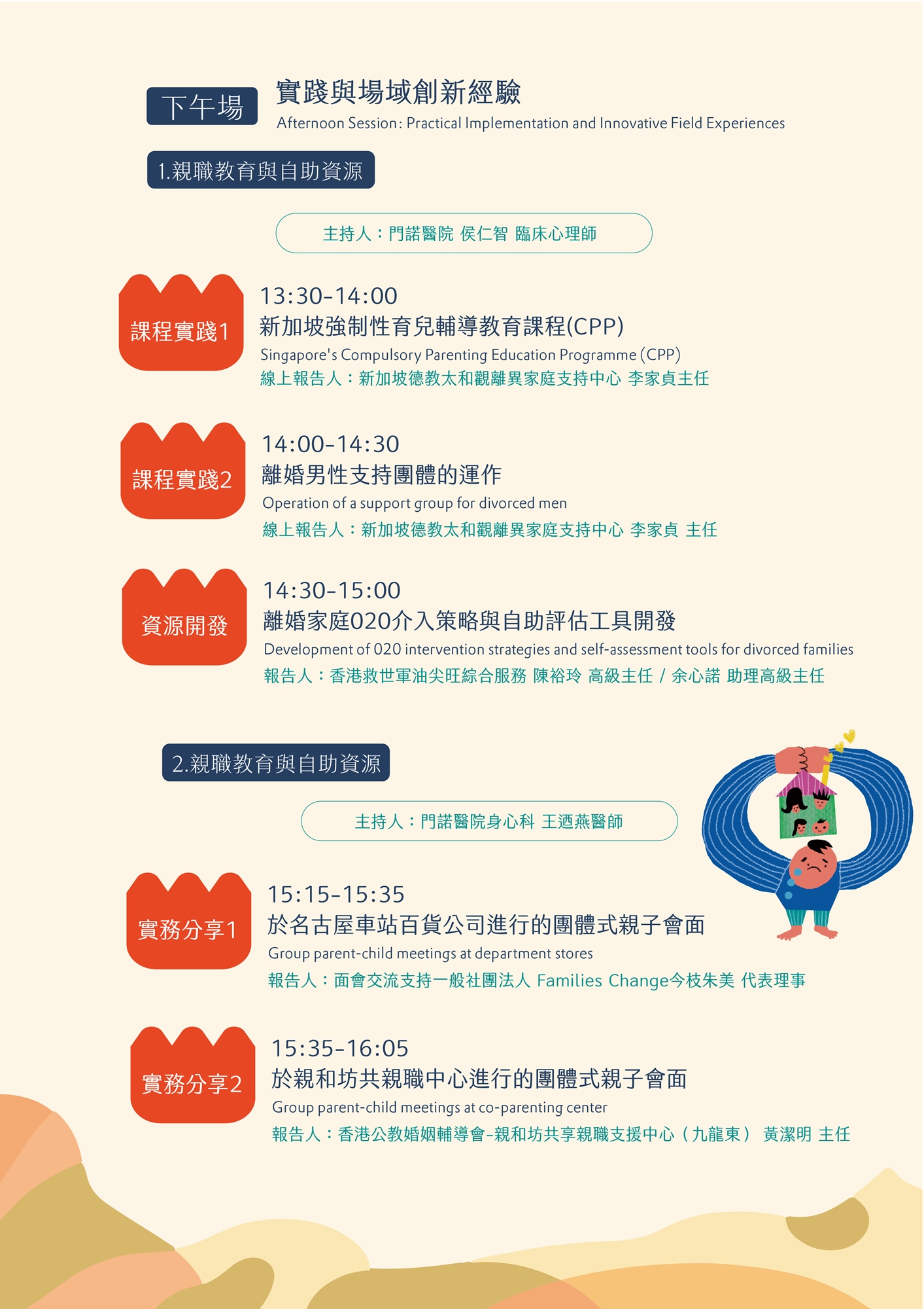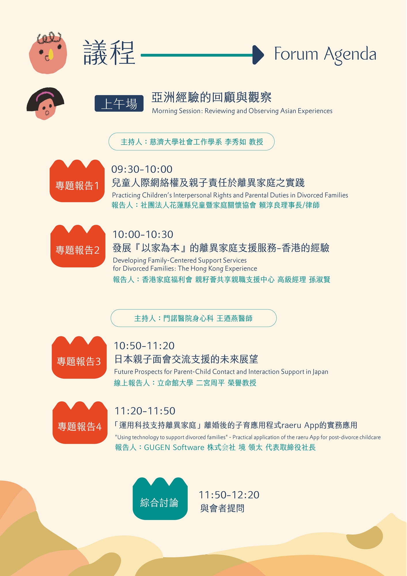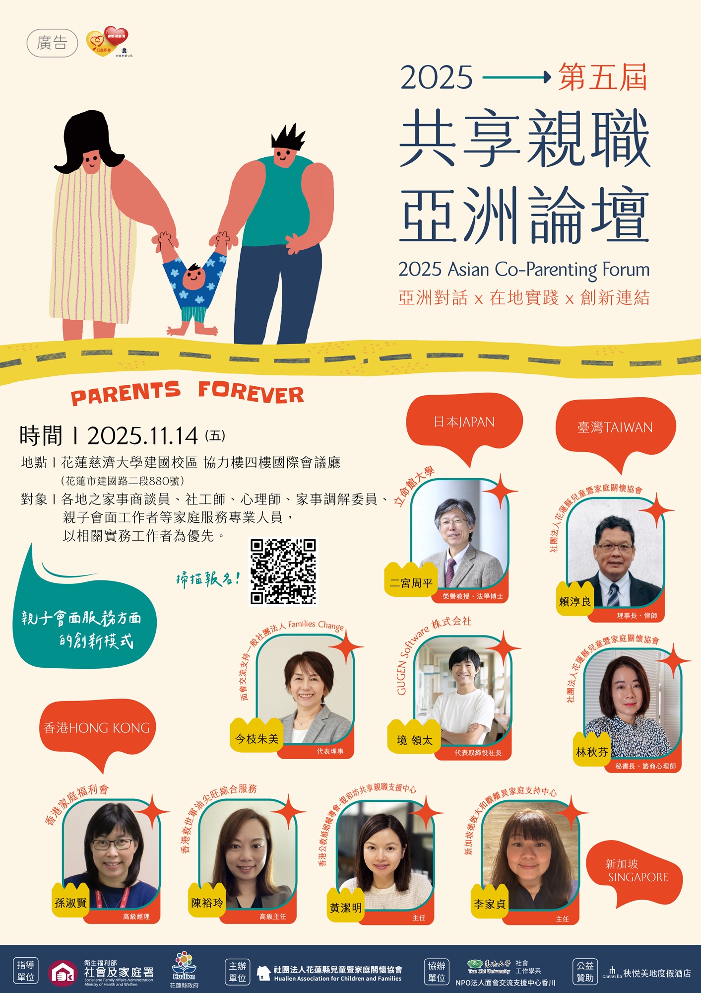 本屆為每兩年一度的第五屆亞洲共親職論壇,將邀請來自香港、新加坡、日本等地的離異家庭服務專業人士齊聚花蓮,與臺灣各地實務工作者共同對話。論壇主題聚焦「亞洲對話、地方實踐、創新連結」,藉由實務分享與制度經驗交流,深化跨國專業學習,也分享本會17年來在高衝突家庭、親職協調與親子會面支持的在地實踐經驗。