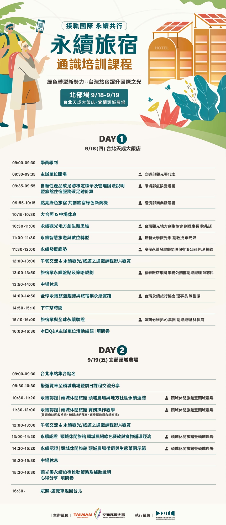 本課程由交通部觀光署主辦,整合產、官、學、研多方資源,聚焦國際永續旅宿標準,系統化導入國際準則認識、永續驗證實務、碳管理策略及節能補助方案等核心議題,協助業者掌握市場脈動、對應政策需求。