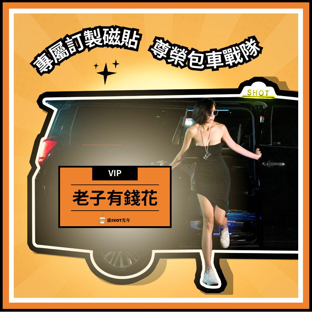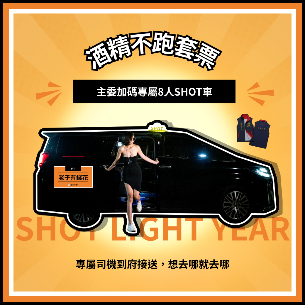 - 如需要SHOT車服務請參考 酒精不跑票( 8 人套票) 。