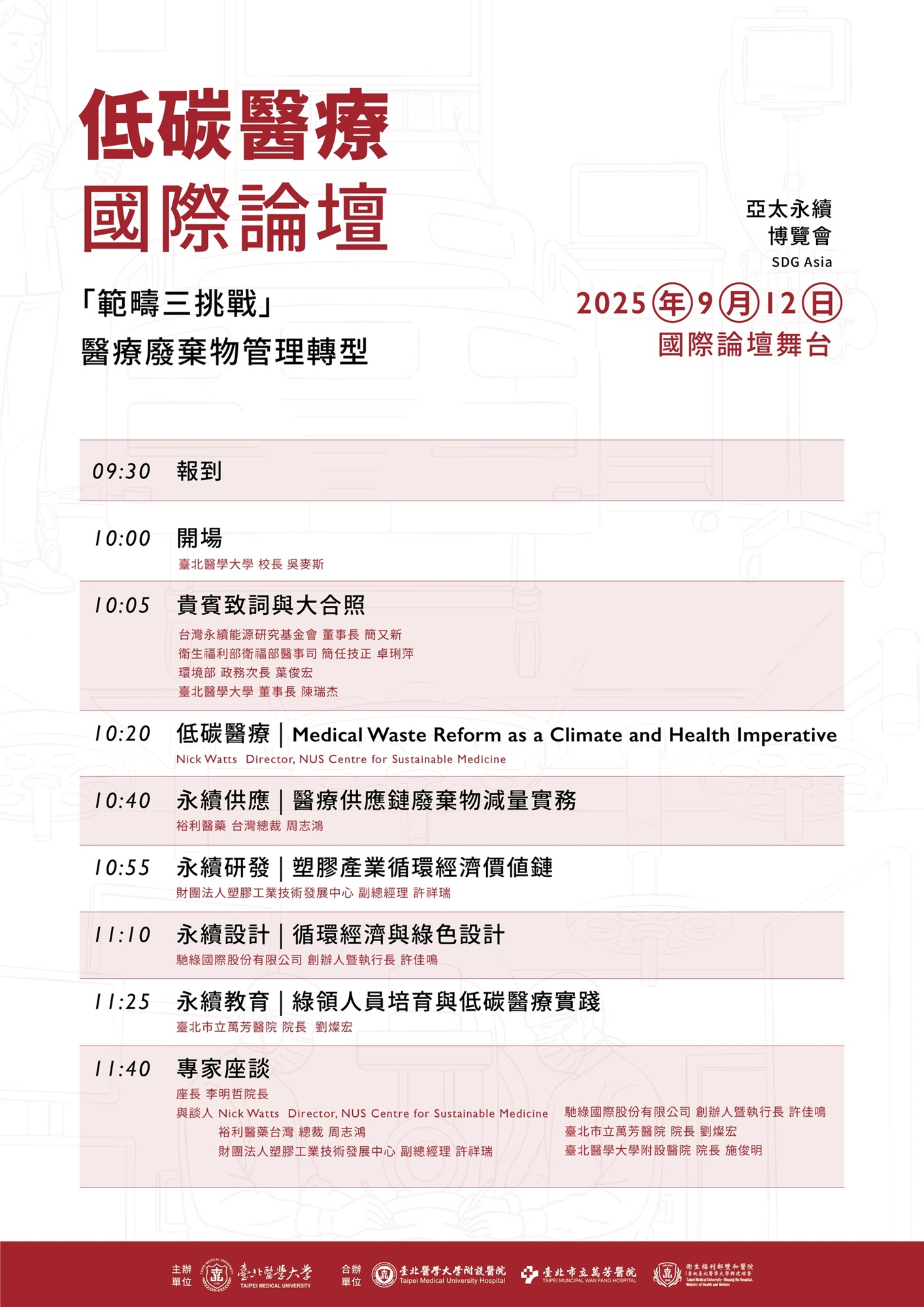 由臺北醫學大學主辦, 臺北醫學大學附設醫院、臺北市立萬芳醫院、衛生福利部雙和醫院 共同承辦之【低碳醫療國際論壇】,以「範疇三挑戰-醫療廢棄物管理轉型」為主題,匯聚國內外專家從供應鏈、產業面、綠色設計及人才培育等面向,凝聚低碳醫療共識。論壇特邀新加坡國立大學永續醫療中心主任Nick Watts 教授(前NHS永續長)發表專題演講,並邀請產官學界進行跨域對談,分享最新趨勢與實務經驗。透過知識交流與策略連結,期望驅動醫療體系邁向廢棄物減量、循環利用與低碳轉型,實現健康與環境雙贏的永續願景。