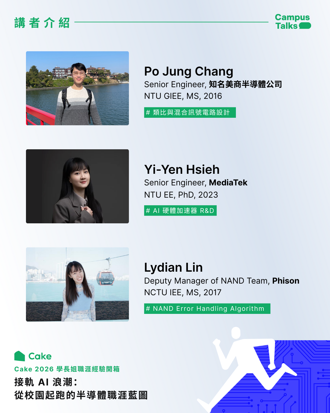 本場活動邀請來自 MediaTek、Phison 和 知名美商半導體公司 的三位工程師學長姐,