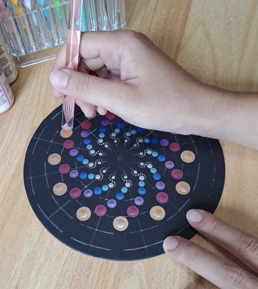 即為“曼陀羅藝術”和“點畫技巧”兩者結合的創作方式,