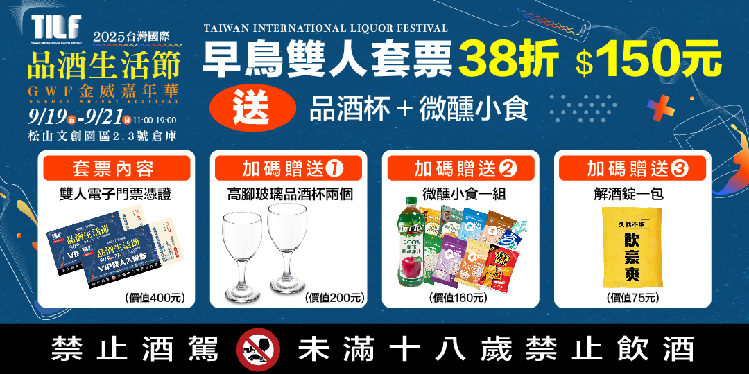 此展特搜全球各地好酒齊聚一堂,讓大家一票逛好喝好,即日起推出早鳥38折優惠雙人套票$150元(價值$400元),加碼再送「玻璃高腳品酒杯」兩個+「微醺小食」一組+「解酒錠」一包,如欲前往參觀請把握早鳥名額,其中最有看頭的地方還有珍稀藏酒、傳承名酒、聯名酒款...等特色酒款,邀您一同蒞臨品酩世界好酒!