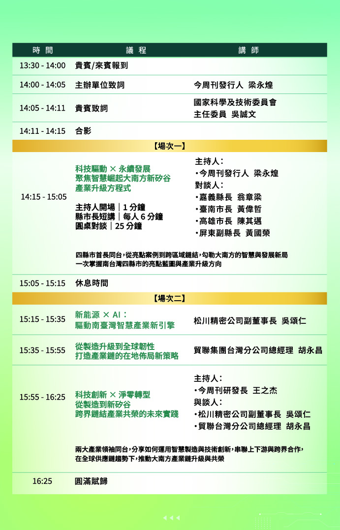 本次論壇將邀請嘉義、台南、高雄與屏東四縣市首長同台,聚焦智慧城市、永續能源與製造升級,打造具有國際競爭力的科技聚落,共同構築智慧城市「新矽大南方」藍圖,結合產業領袖展現產業升級的關鍵路徑。