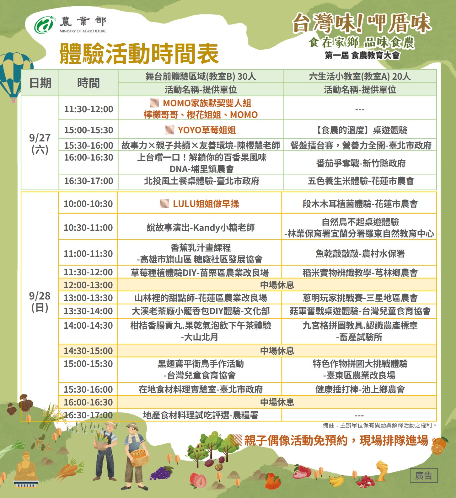 ➡️親子偶像表演、說故事、座談分享及各種食農體驗和DIY,歡迎一起來體驗、學習食物背後的生活小知識。(需事先報名,額滿就要現場候補囉)