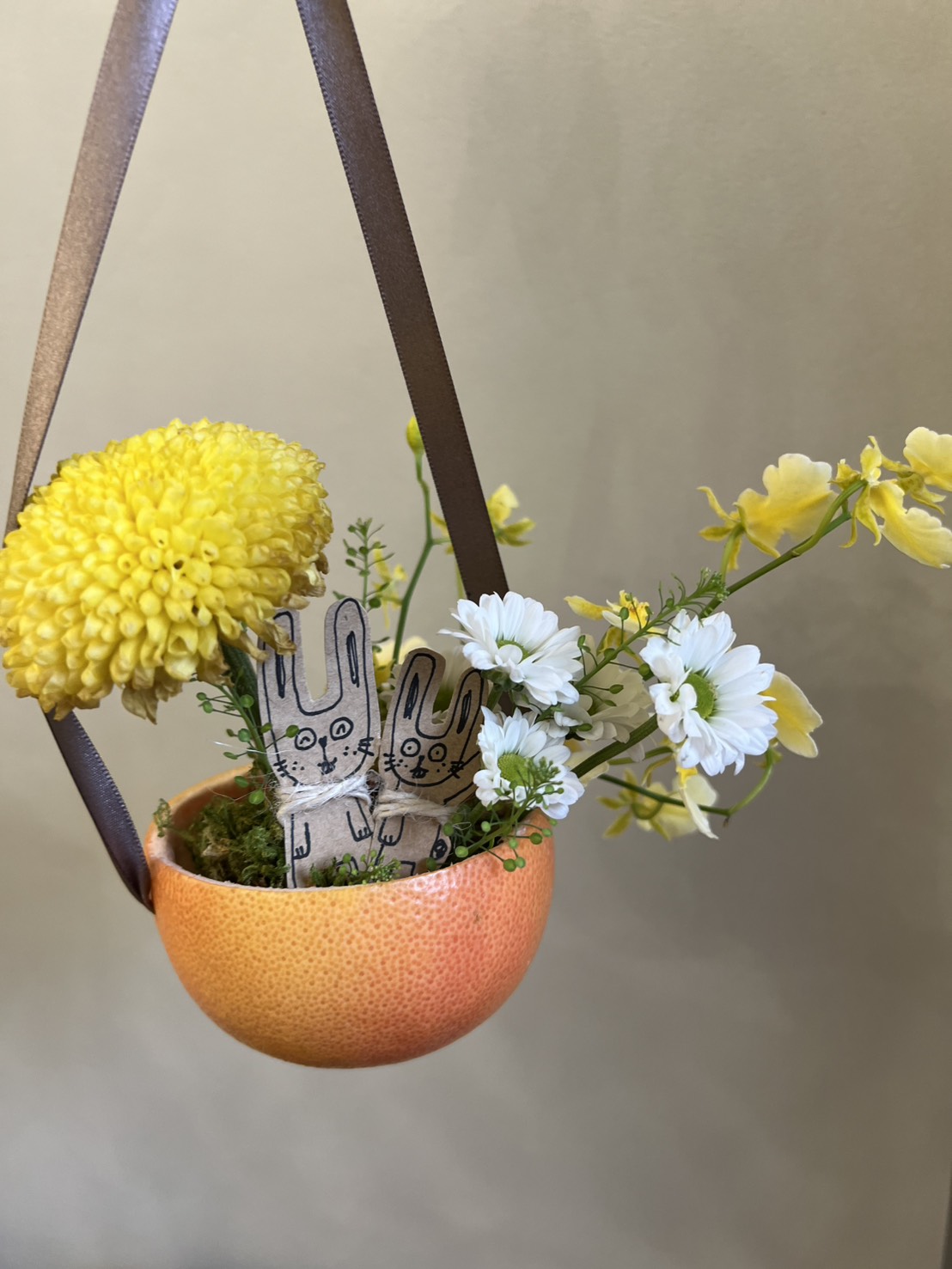 創作作品:以柚類水果(如葡萄柚或柚子)作為盆器,搭配黃白色系鮮花,完成屬於自己的「月亮花景」