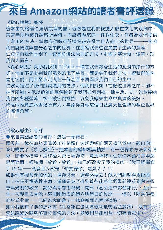 今年五月出版的《從心解脫》書中,仁波切結合佛法智慧、正念禪修、現代心理學,提供讀者一套提升專注力、擺脫焦慮、開啟通往內在的道路,鼓勵讀者經由禪修慈心悲心、六波羅蜜等,並思惟苦樂之因與萬法依存性,擁抱一個不設限的生命。本書甫一出版,已經佳評如潮。