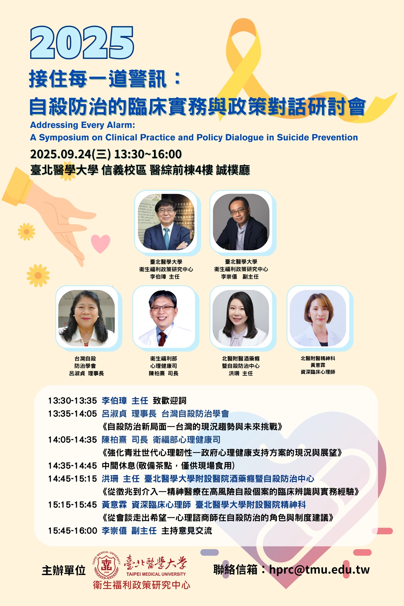 本次研討會以「接住每一道警訊:自殺防治的臨床實務與政策對話」為題目,聚焦於自殺防治的整體發展與制度應對,從當前政府行動、趨勢數據到精神科臨床與心理諮商實務,全面剖析當前台灣自殺防治的挑戰並藉此提出相關政策建議。期盼呼應並延續9月10日「世界自殺防治日」的訴求與影響力,透過多元觀點的交流與對話,深化社會大眾對自殺防治議題的認識,為身處困境的人們,打造更完善的支持體系與求助網絡。