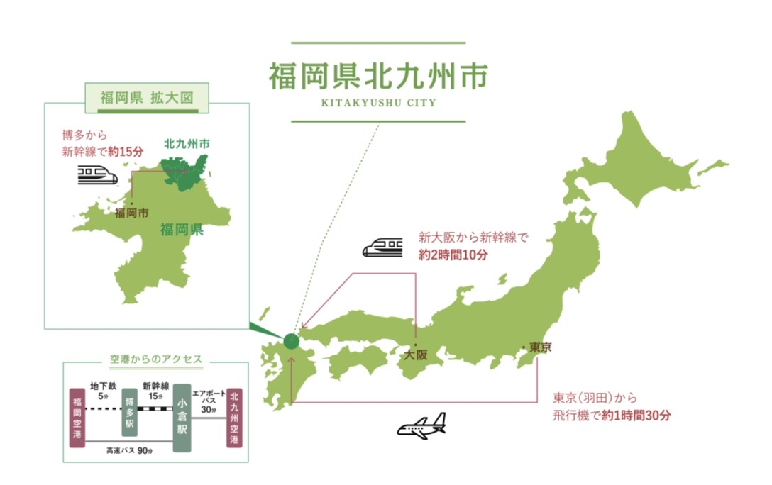 北九州市位於日本九州的最北端,隔著關門海峽與本州山口縣下關市相望,是連接本州與九州的重要玄關城市。從台灣出發,搭乘直飛航班抵達福岡機場後,再轉乘新幹線僅需約15分鐘即可到達,非常便利。