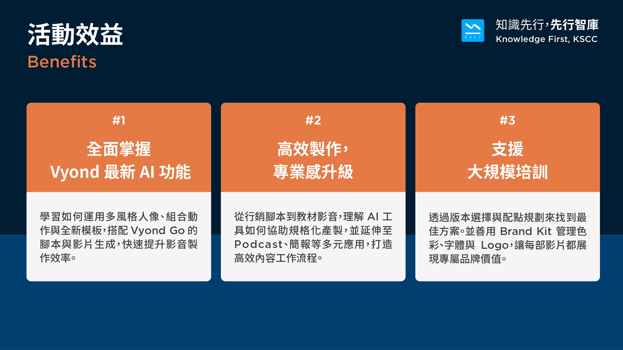 - 介紹 Vyond 最新 AI 功能,協助學員快速掌握腳本生成、影音製作與多風格角色應用的實務技巧