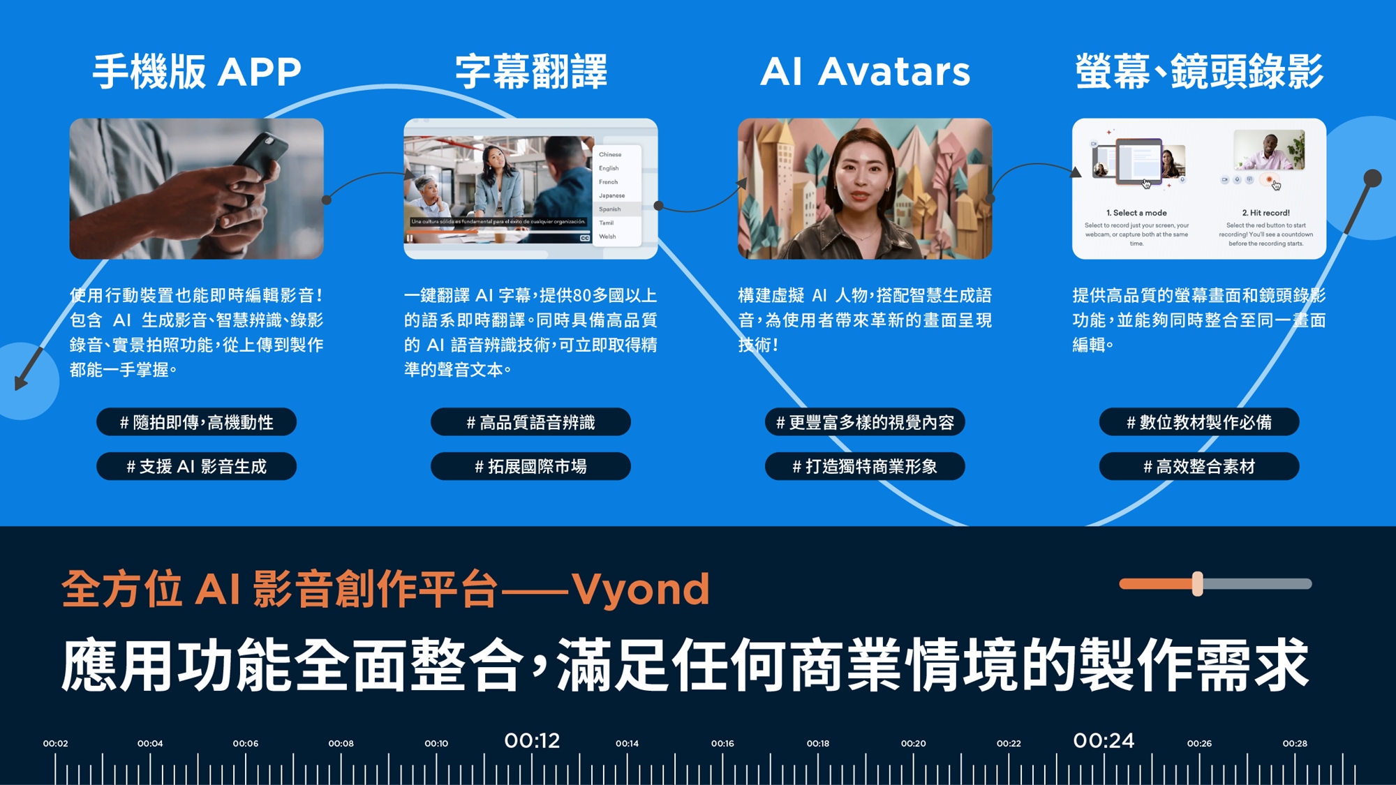 在 AI 浪潮下,企業與教育單位都面臨大量影音內容的製作需求。如何兼顧效率、品質與品牌一致性,成為培訓、行銷與內容團隊的核心挑戰。本研討會將帶你掌握 Vyond 最新 AI 功能,從腳本自動生成、影音快速產製,到多風格人像與模板應用,全面提升創作效率。同時,我們也將解析 AI 語音延伸應用、版本與配點制度,以及 Brand Kit 的品牌管理策略,協助團隊打造高效又具專屬識別的影音內容。