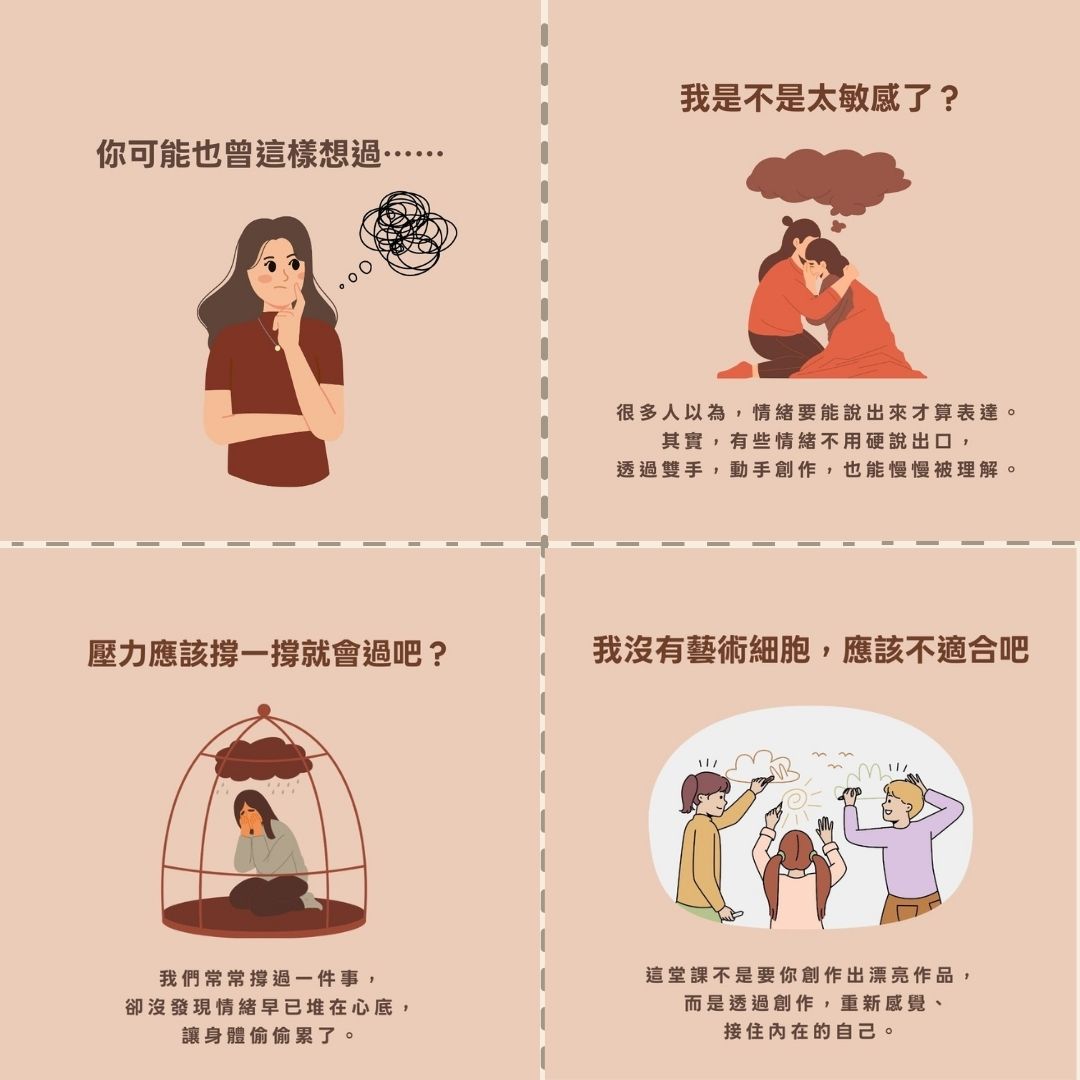 ✦ 創作實作:「我的壓力怪獸」、「情緒風景圖」、「療癒小物件」等主題