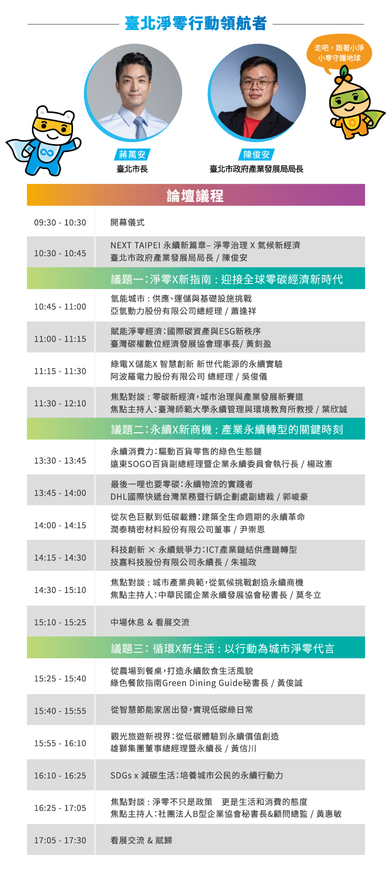 因應氣候變遷所帶來的全球挑戰,永續轉型已成為當代城市與產業競爭力的關鍵。本論壇廣邀國內外專家與產業代表,匯聚國際趨勢與在地行動,共同開啟邁向淨零未來的重要對話,使臺北成為引領永續行動的先行者。