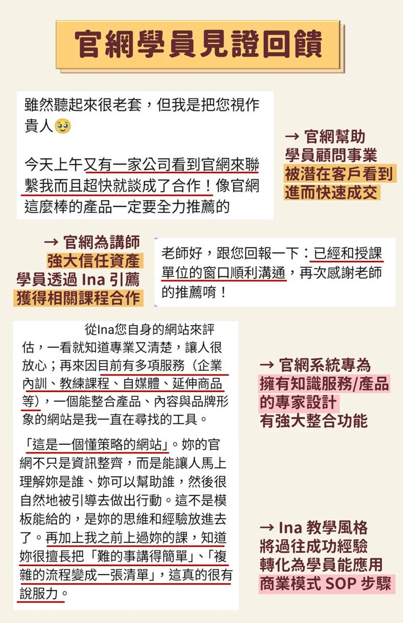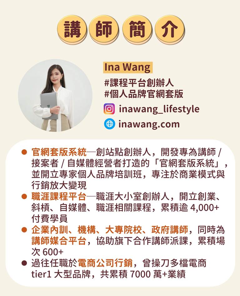 當天講座將介紹我們的專家個人品牌官網,並提供參加者外面沒有的限時限量優惠,有興趣的人歡迎先參考官網介紹頁內容:https://inawang.com/pricing/