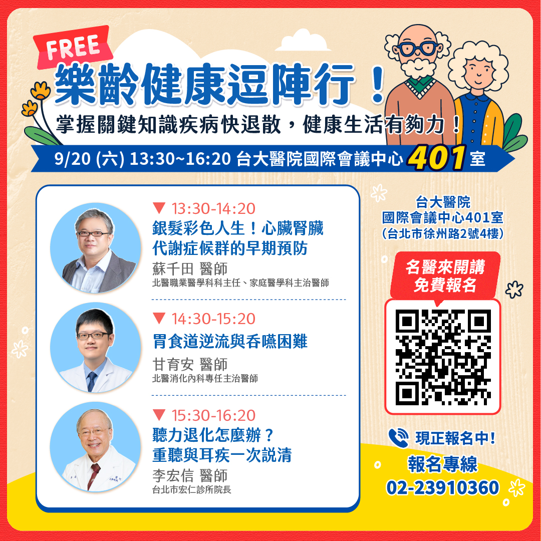 名醫開講-免費健康公益講座,由臺北醫學大學校友會教育基金會、中華民國防高血壓協會、財團法人武聖關公文化教育發展基金會 共同支持主辦,每期邀請不同科別之專業醫師出席,傳達正確的保健新知,開放民眾免費報名參加,歡迎揪團預約報名喔!