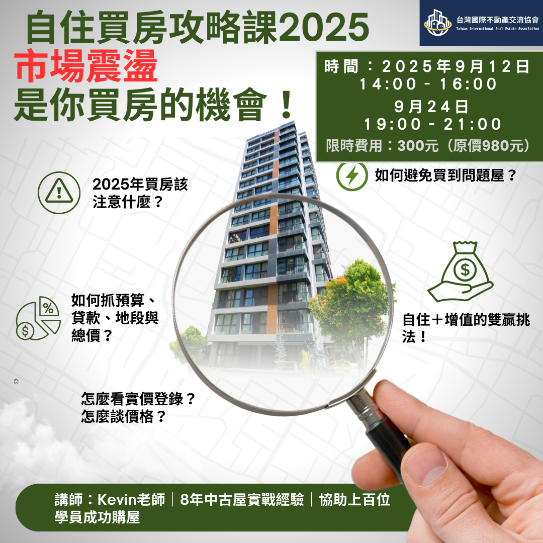 你是否擔心買貴、踩雷,或錯過最佳時機?本堂「自住買房攻略課」由8年實戰經驗講師親授,帶你全面解析買房流程、預算規劃、實價登錄、地段評估與談價技巧,並揭露常見陷阱,讓你買房不再迷惘!